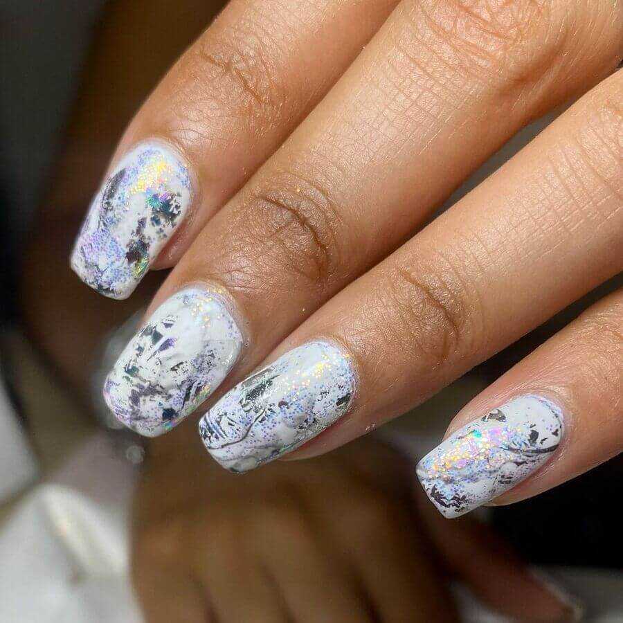 Ее разрезают на мелкие кусочки разной формы, имитирующие осколки стекла. Затем они выкладываются на ногти и покрываются глянцевым топом. Создается впечатление, что в дизайне использовались мелкие стеклышки. Эту идею можно взять на заметку, выбирая новогодний маникюр 2021 с блестками. На фото ниже праздничный маникюр с фольгой в технике «битое стекло». Как вам такая идея?