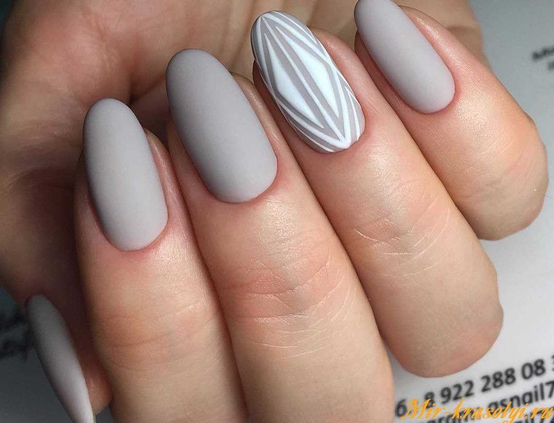 Пастельный маникюр на коротких ногтях в сером цвете позволит подчеркнуть индивидуальность стиля. В этом сезоне стилисты предлагают использовать матовое покрытие. Оно смотрится эффектно, необычно и элегантно. Если вы собрались на светский раут, добавьте к такому покрытию немного блеска и вы получите роскошный дизайн, который подойдет к любому вечернему наряду.