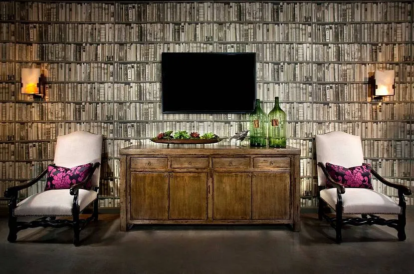 Гостиная в стиле гранж с открытыми стеллажами во всю стенуИсточник roomester.ru
