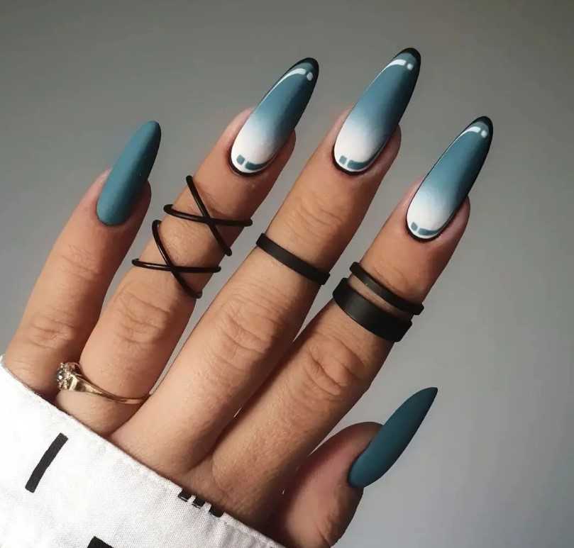 Абстракция с намеком на зимнее настроение, созданная с помощью геометрических техник дизайна и омбре, является горячей тенденцией.