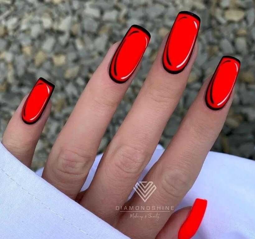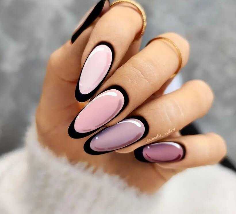 - Французский маникюр. Здесь кончик не окрашивается в привычный белый или другой цвет, а выполняется в комиксном стиле — с черной окантовкой и бликами. К слову, такой вариант стоит выбирать, если вы хотите, чтобы не было видно отросшие ногти. В этом случае ноготки у основания покрыты нюдовым цветом, без черного контура, поэтому отросший край не будет так заметен.