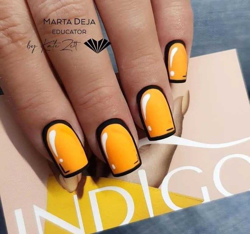 Для этого нейл-мастера красят ноготки в неоновый или пастельный цвет и по их периметру рисуют тонкие или толстые черные линии-контуры. А черным и белым лаком прорисовывают блики и тени.