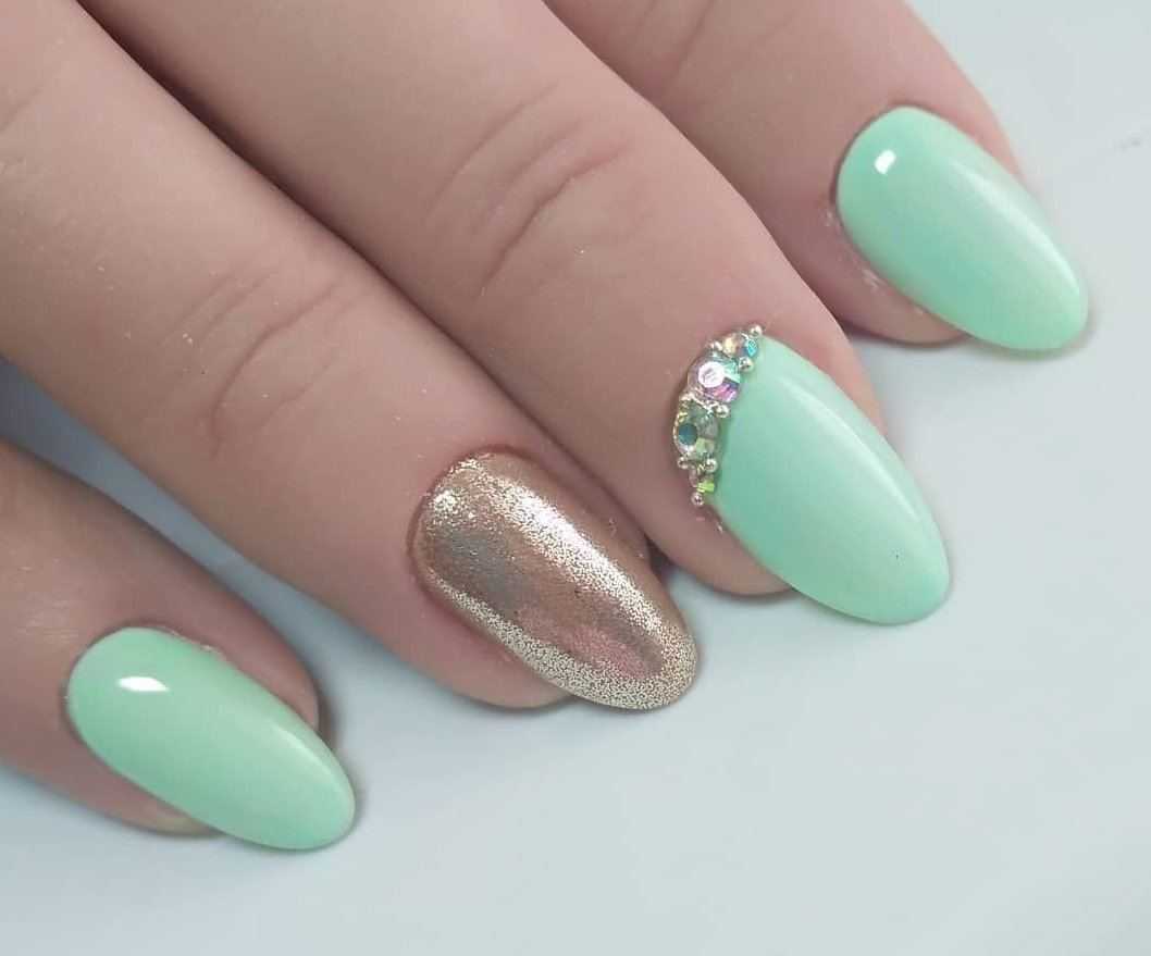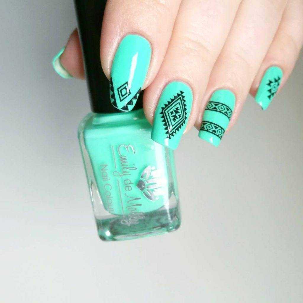 Черный стоит использовать аккуратно. Он очень контрастирует с мятным. Лучше выделить 1 или 2 ногтя полностью покрыв черным цветом. Либо же сделать акцент черными дизайнами, к примеру наклейками или четкими линиями.