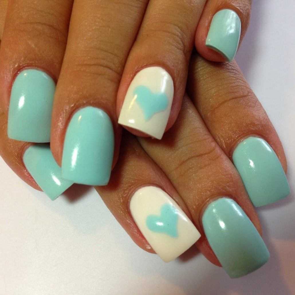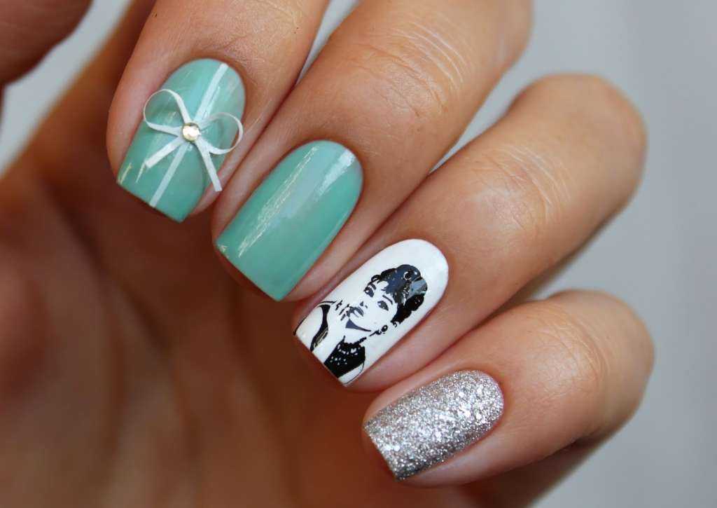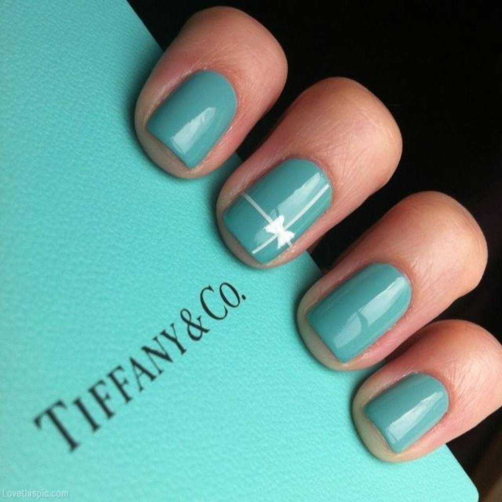 Классический маникюр от Тиффани может вызывать ассоциацию с торговой маркой, в честь которой он получил свое название, а точнее с их коробками для ювелирных изделий. Коробочки как раз выполнены в бирюзовом стиле и перевязаны белым бантом. Если вы умеете рисовать, то на ногте безымянного пальца также можно изобразить маленький ключик лаком золотого или серебряного цвета. В классическом исполнении маникюр всегда выглядит нежно и романтично.