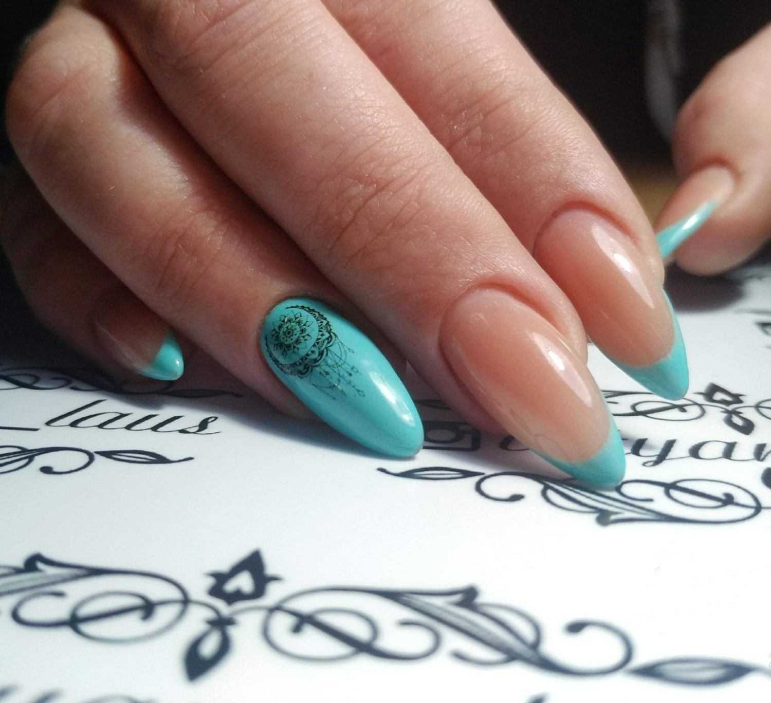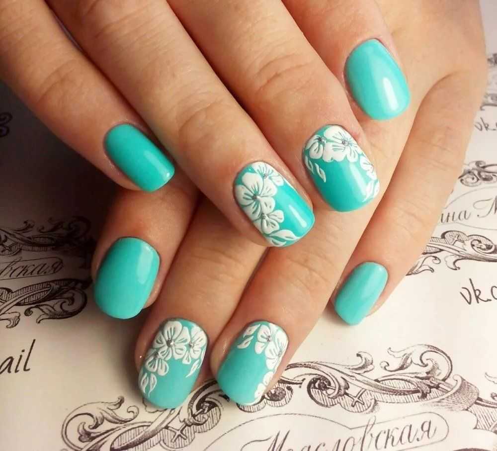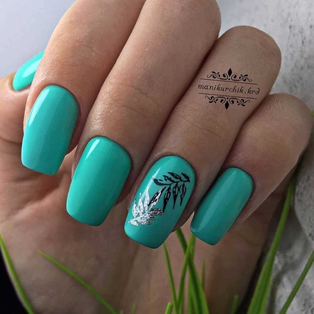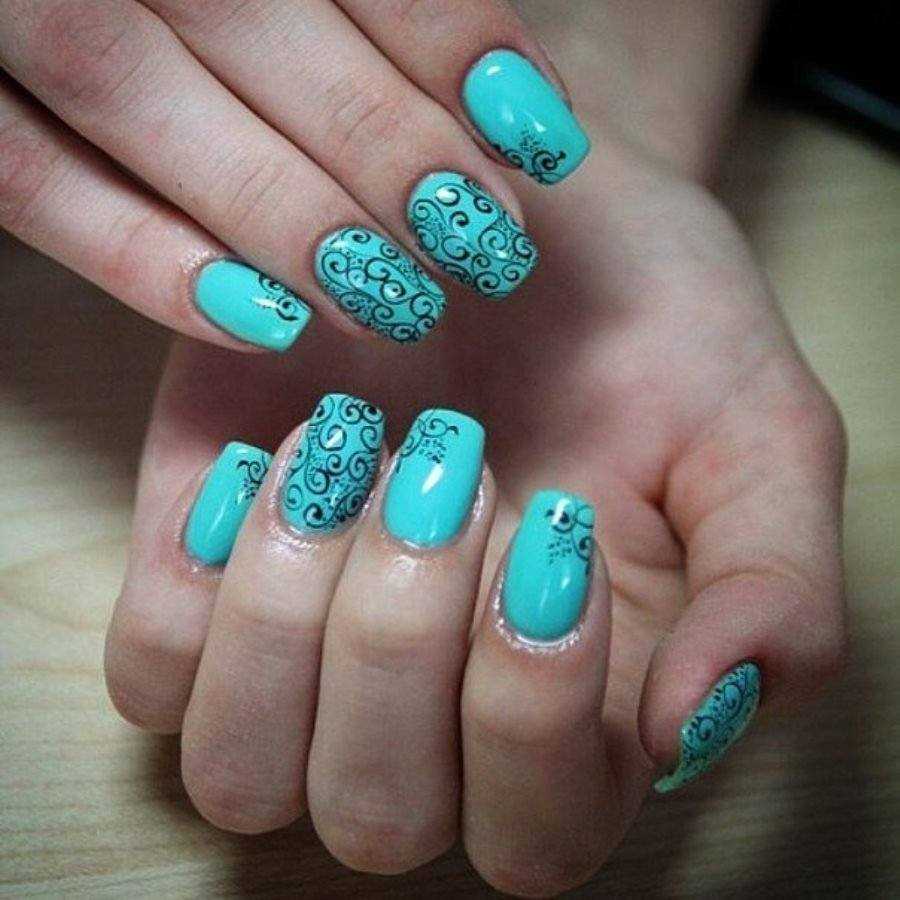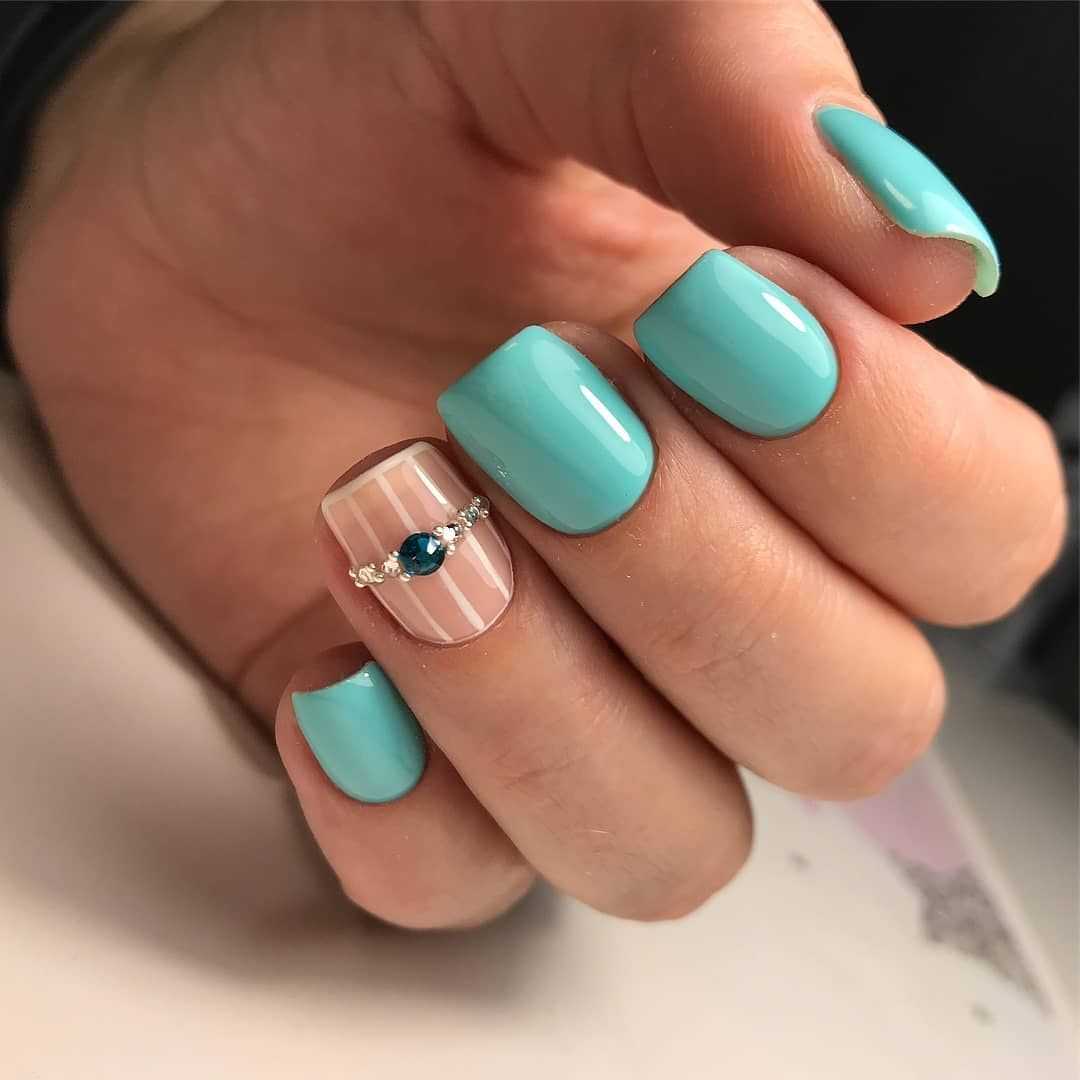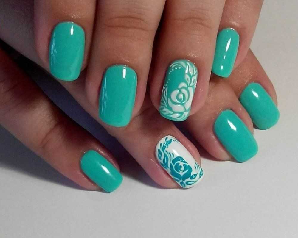 В маникюре может быть использован не только бирюзовый цвет, но и различные его оттенки в комбинации с другими цветами.