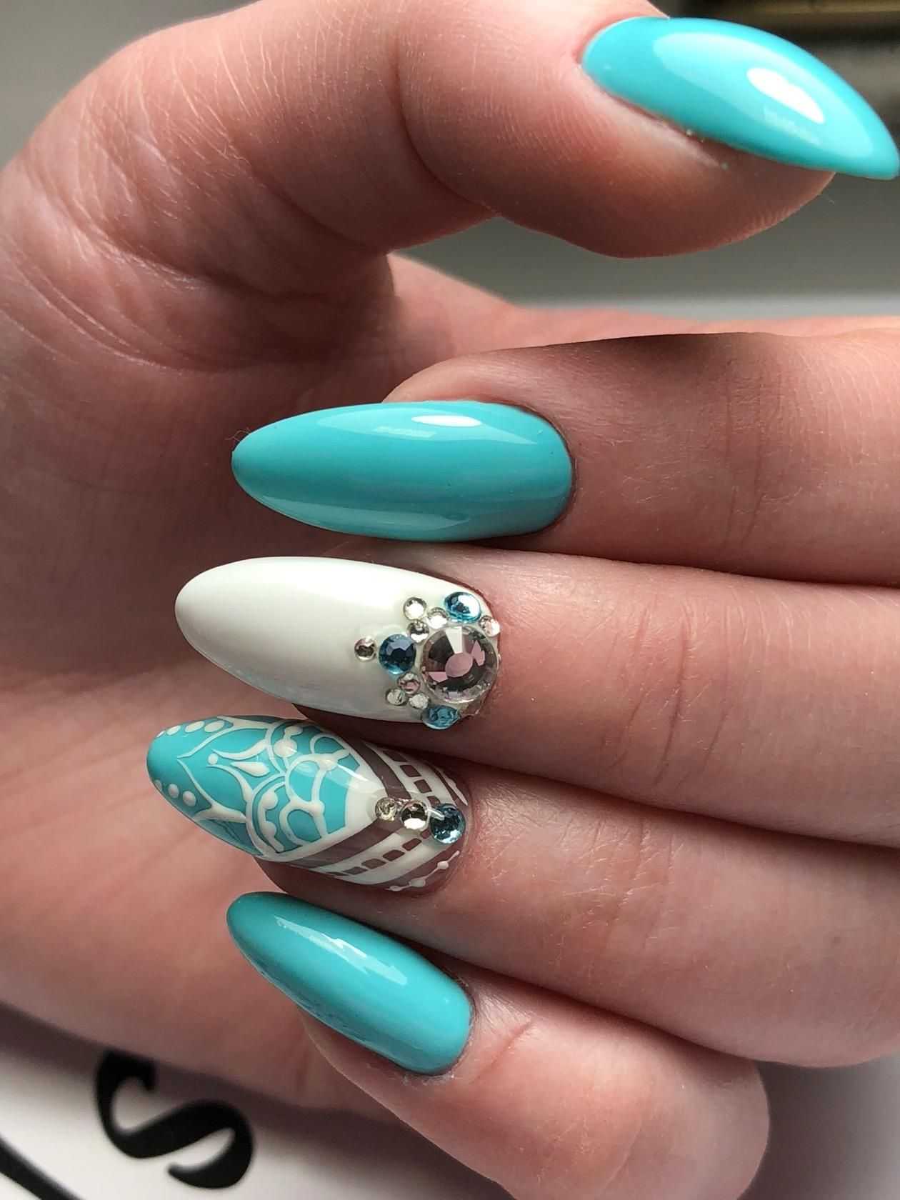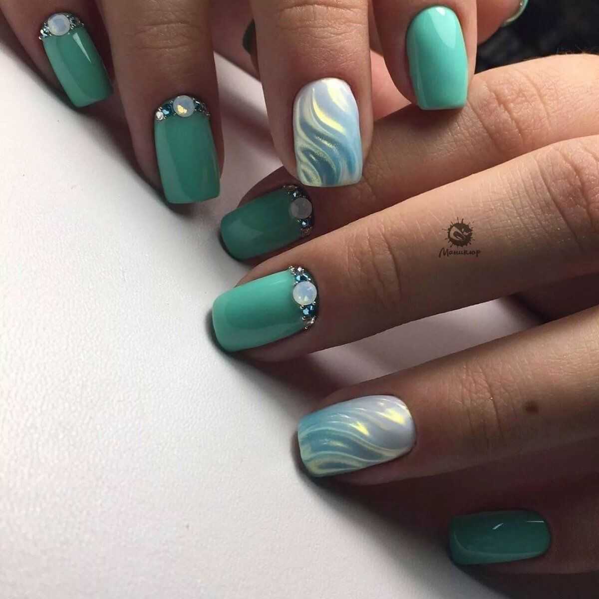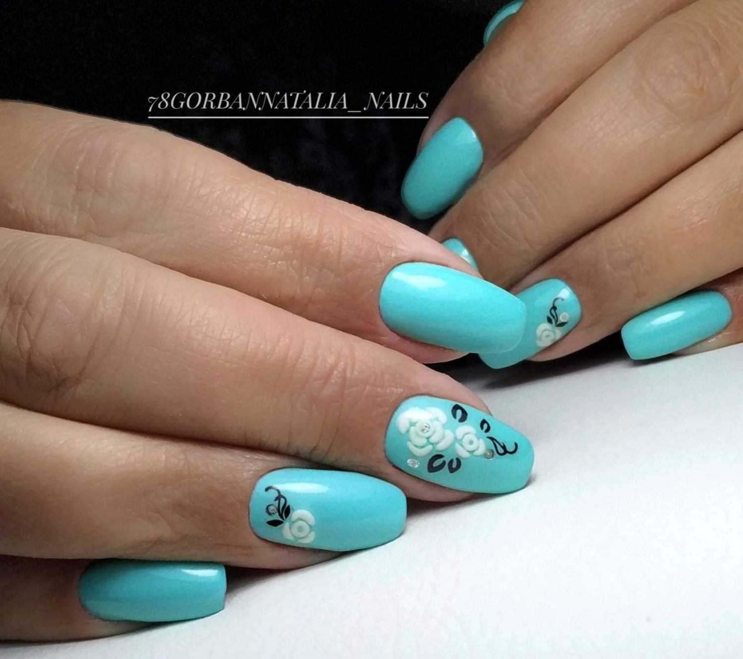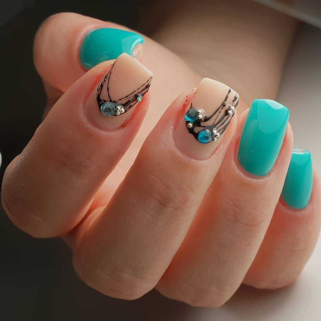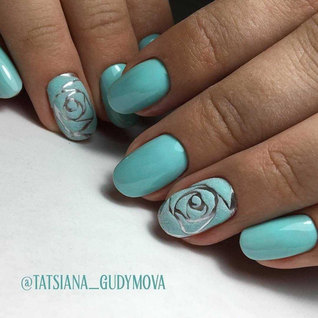 В маникюре может быть использован не только бирюзовый цвет, но и различные его оттенки в комбинации с другими цветами.