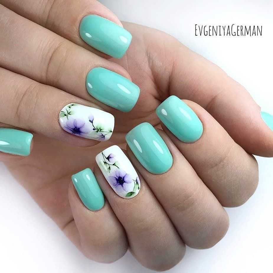 Довольно популярной окажется роспись ногтей в цветочной тематике с использованием лиловых и сиреневых оттенков. Изящество образу подарит модный омбре, благородный «тандем» серебряного и бирюзового, подчеркивающий свежесть и натуральность образа.