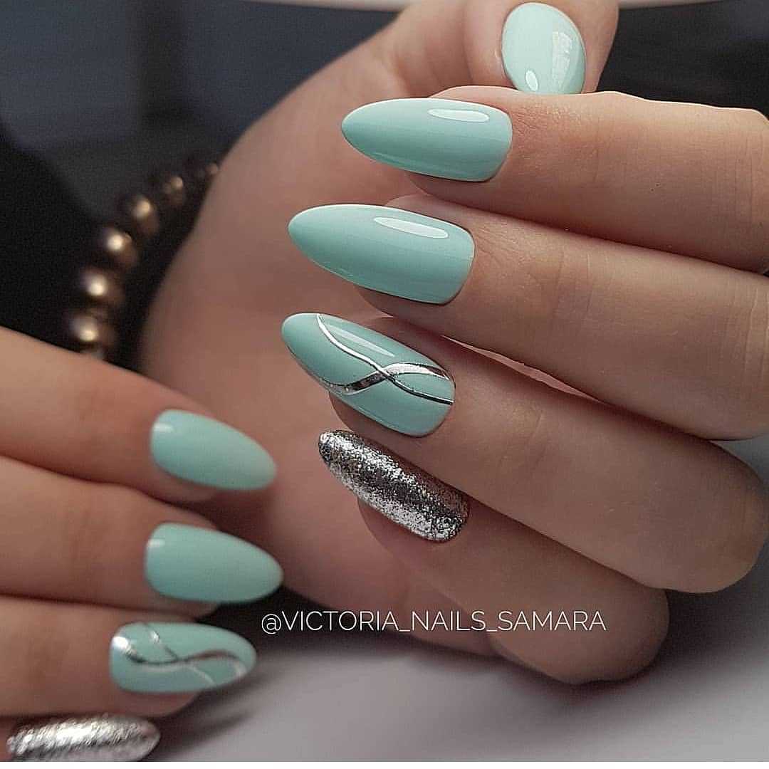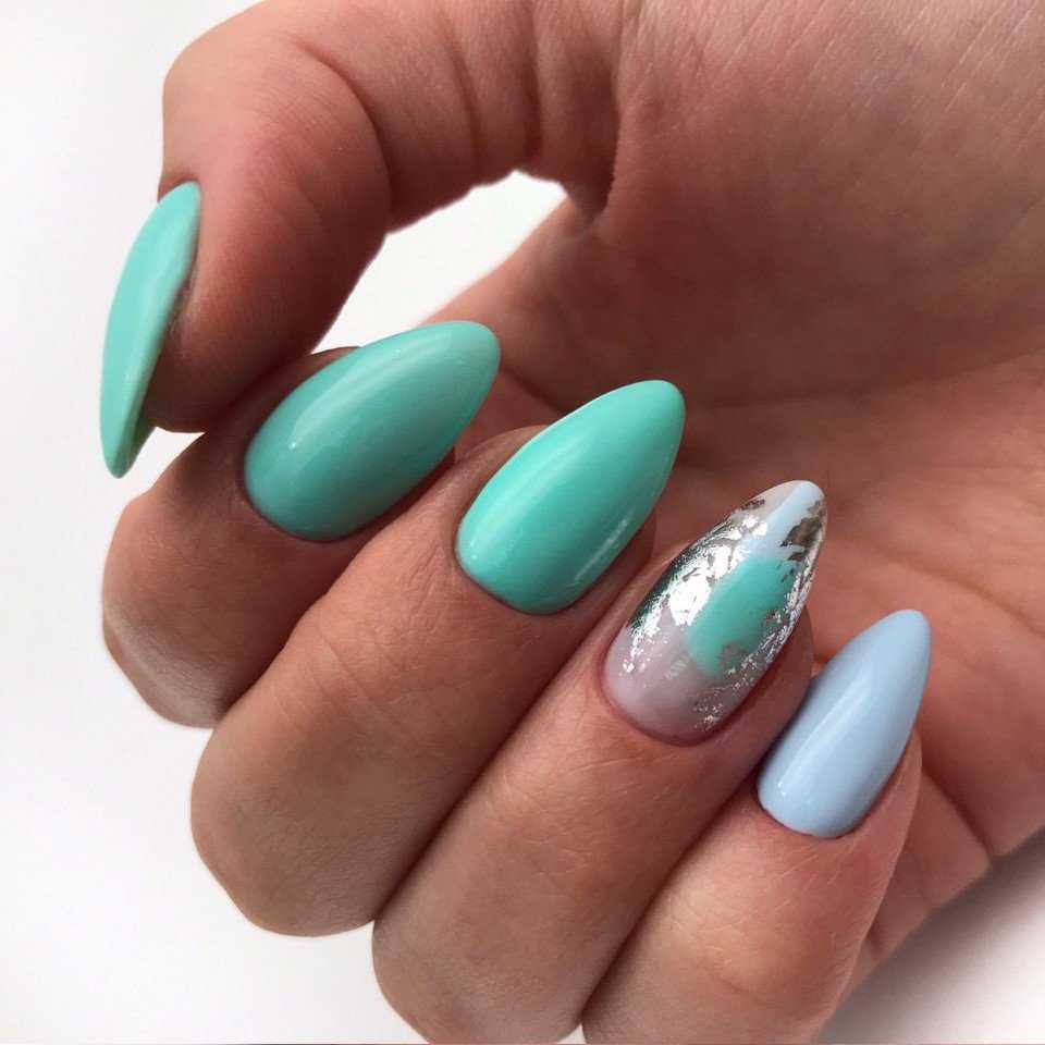Очевидно, что голубой и мятный всегда находились в гармонии. Наверное, это первый цвет, который приходит в голову при вопросе » Что добавить к мятному маникюру?». Лучше всего выбрать голубые оттенки, которые близки к васильковому цвету.