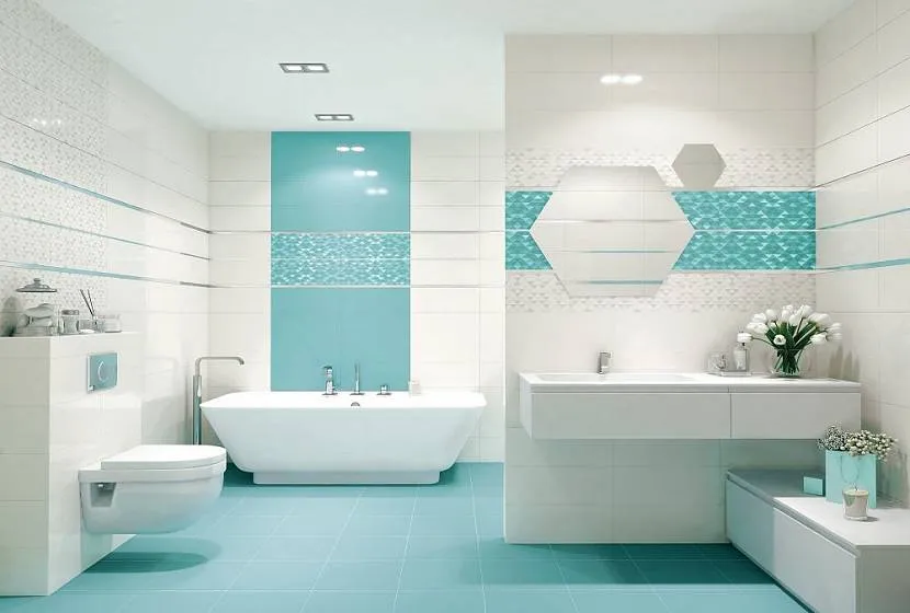 Дизайн каждой ванны оформляют в зависимости от наличия свободного пространства. Приветствуется использование в одинаковых пропорциях белого и бирюзового. Если помещение обладает внушительной площадью, тогда можно создать индивидуальную планировку: отделить душевое место от умывальника, расположить унитаз так, чтобы он не мешал во время приема банных процедур.