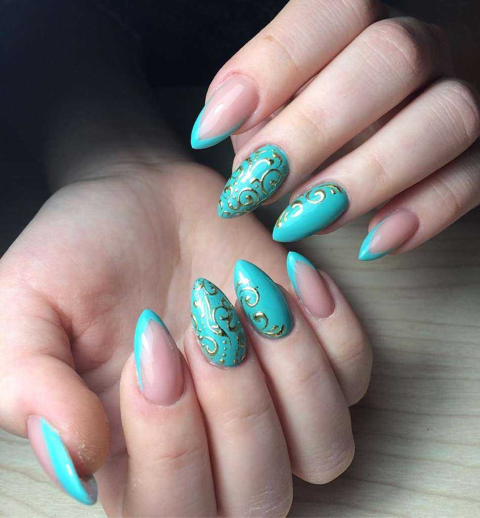 - Разумное использование цветовой гаммы при создании нейл-арта. Доминирующим цветом любого оформления ногтей остается бирюзовый цвет постельных тонов.