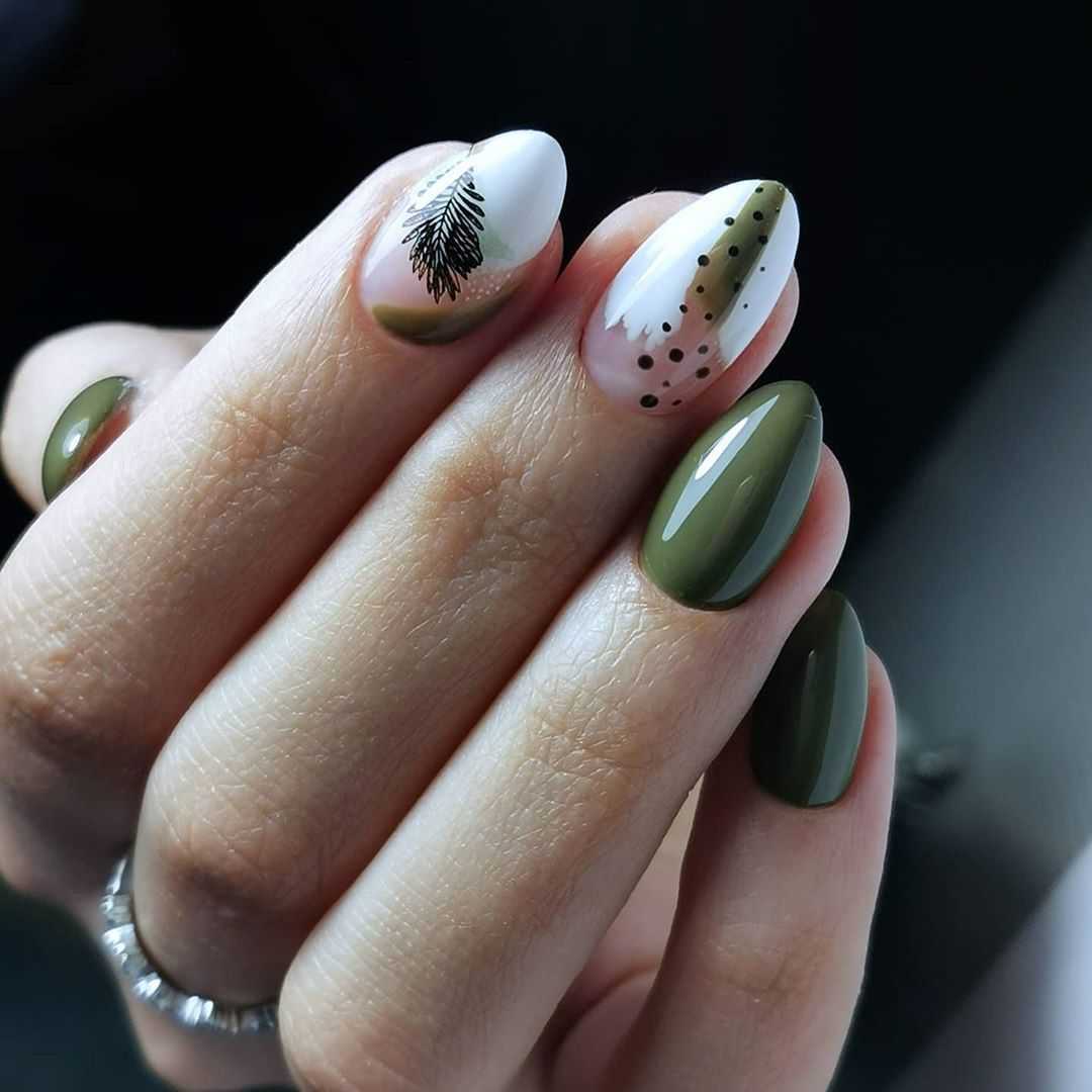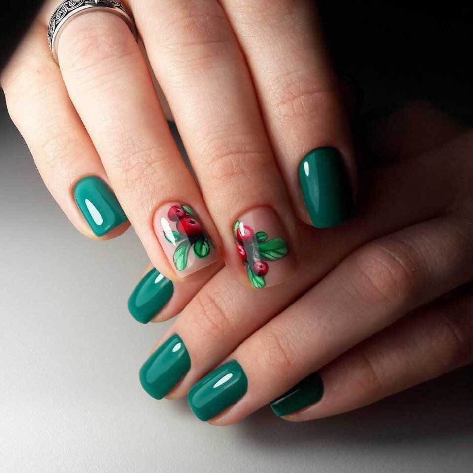 Темно-зеленый оттенок чаще всего выбирают для холодного времени года – осени или зимы, ранней весны. Но им также можно дополнить и яркий летний маникюр, прорисовывая им отдельные элементы или оттеняя более насыщенные, сочные цветовые «пятна».