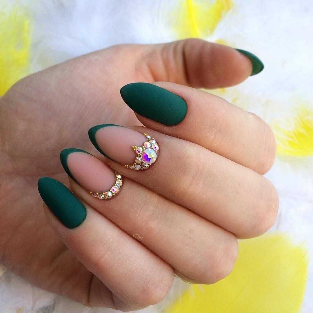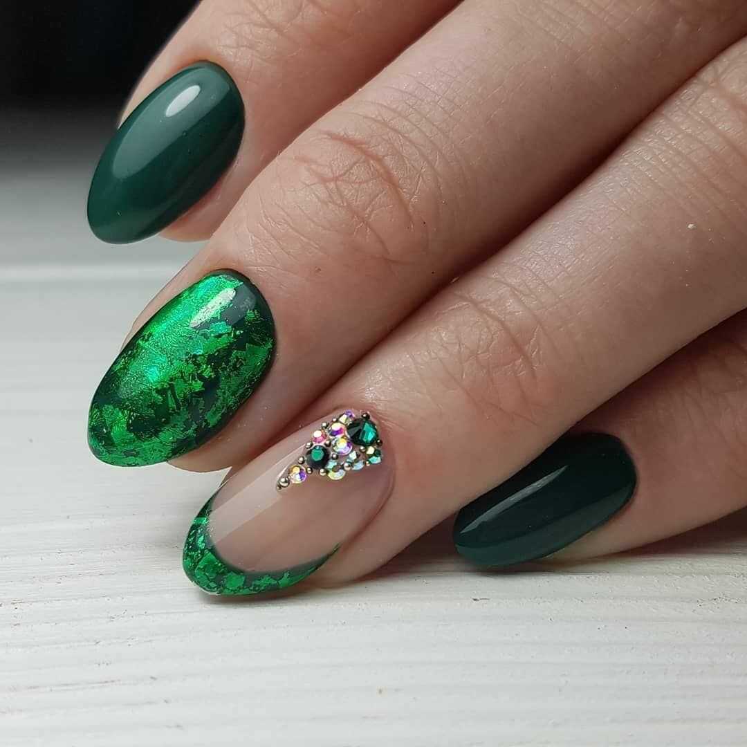 Использование зеленых украшений поверх другого цвета лака для ногтей также является интересным вариантом. Например, сочетание глянцевого черного оттенка с аккуратными изумрудными стразами – стильный и изысканный вариант.