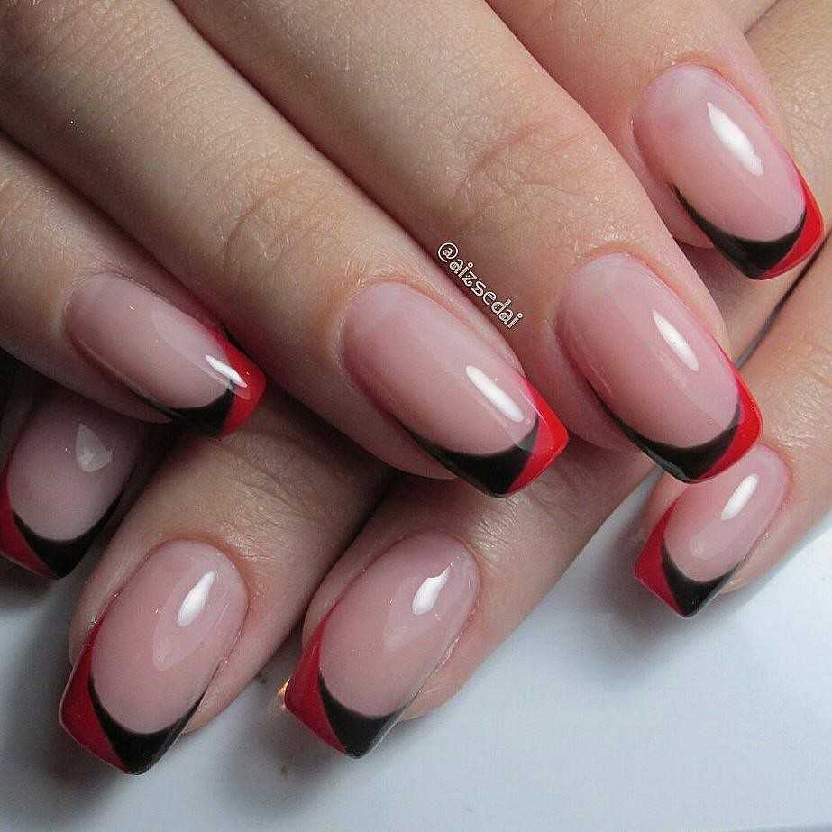 Яркие краски в домашних условиях следует использовать очень осторожно, потому что французский маникюр красный с любым дополнительным цветом, кроме близкородственных (розового и бордового) будет выглядеть так, будто вы неаккуратно открывали варенье и перепачкались
