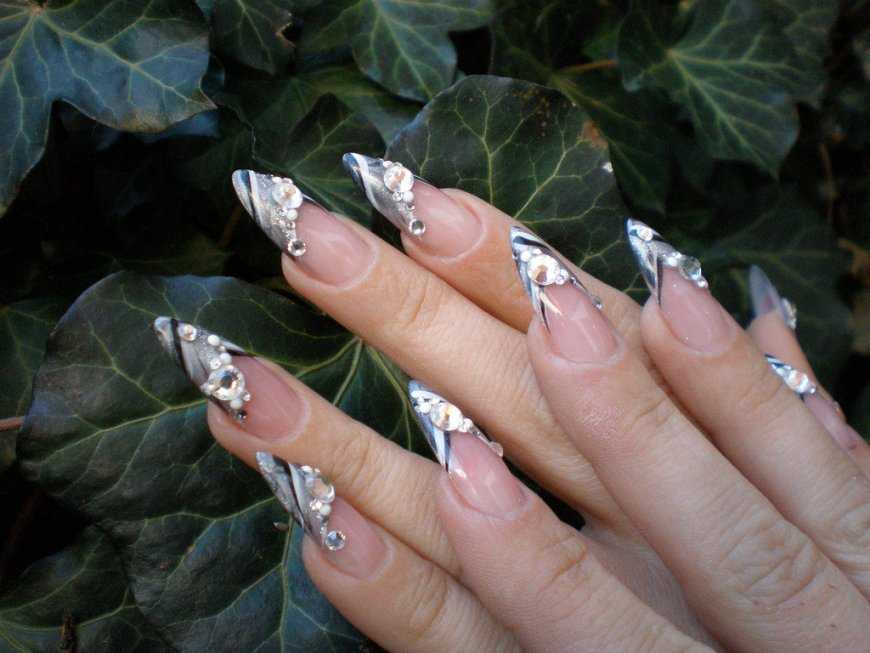 Для вечернего выхода можно придать немного блеска серо-розовому маникюру, заменить серый цвет серебристым или добавить декоративных элементов. Для этого отлично подойдут некрупные стразы. Расположить их можно по краю кутикулы.
