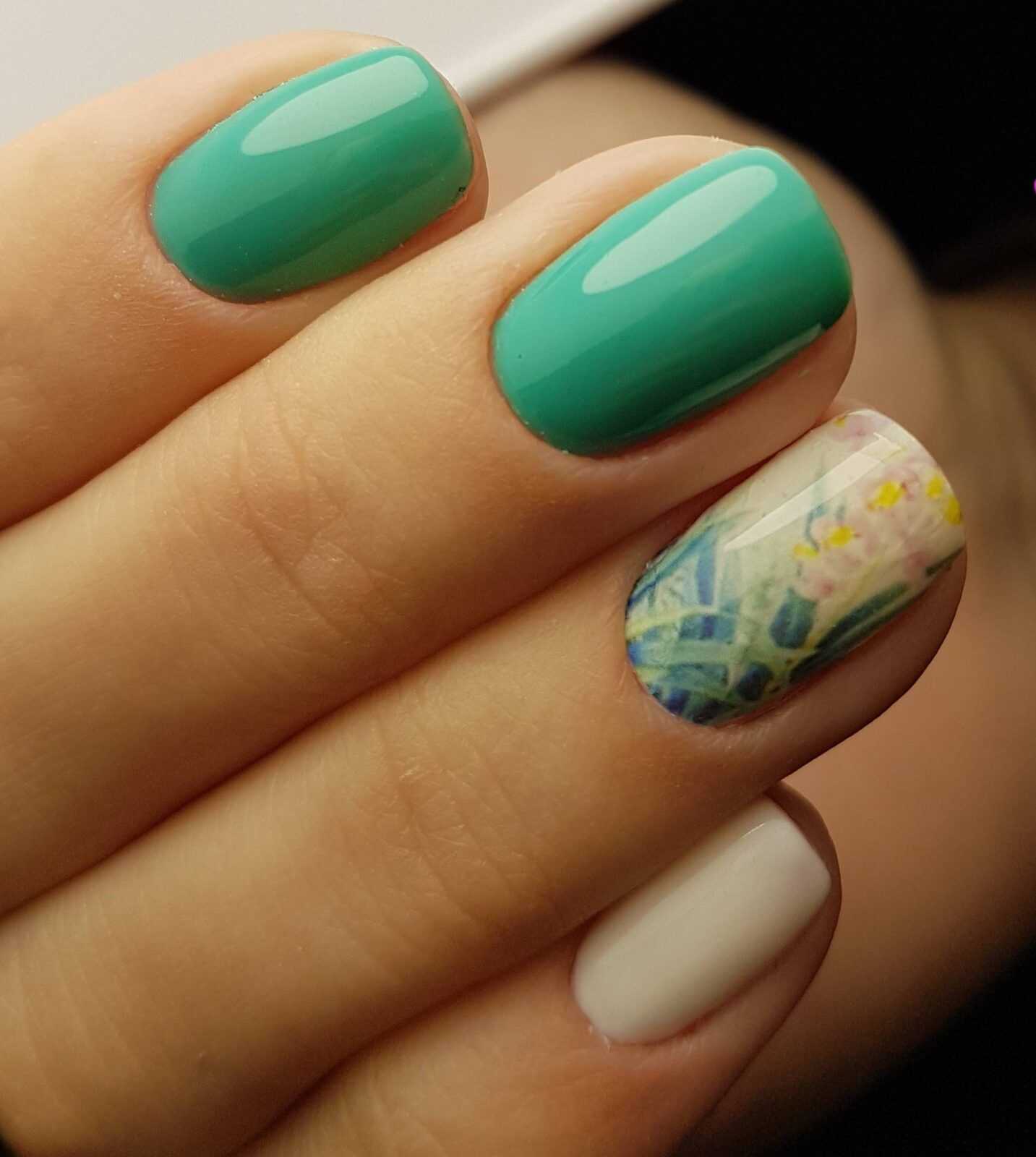 - яркий лазурный (морской), мятный – такой оттенок шикарно смотрится в глянце. Нежно и в то же время сочно выглядит однотонное покрытие на коротких ногтях, актуально в теплое время года;