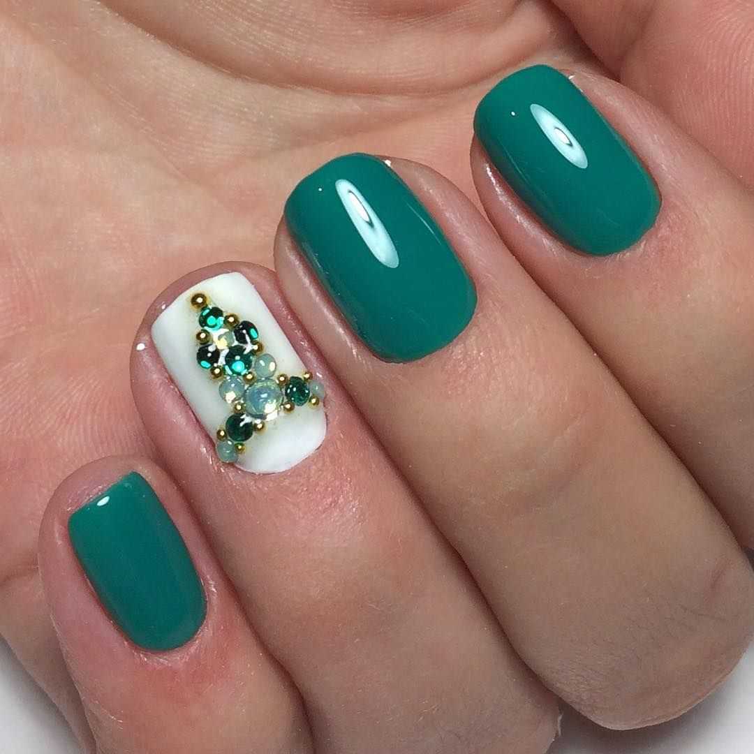 - последний вариант: монохромное зеленое покрытие с использованием стразов Сваровски и рисунков. Насыщенный глубокий пигмент позволяет цвету раскрыться, а дополнительные элементы декора – засиять и превратиться в действительно шикарный дизайн. Можно дополнить его прямыми линиями, нарисованными черной гель – краской или красиво выложить камушки.