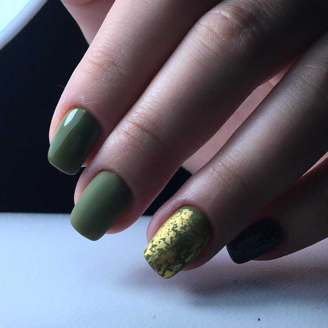 Маникюр зеленого цвета можно разбавить небольшими вкраплениями фольги золотого оттенка. Нейл-мастера используют для этих целей поталь — специальный материал, который имитирует эффект покрытия сусальным золотом.