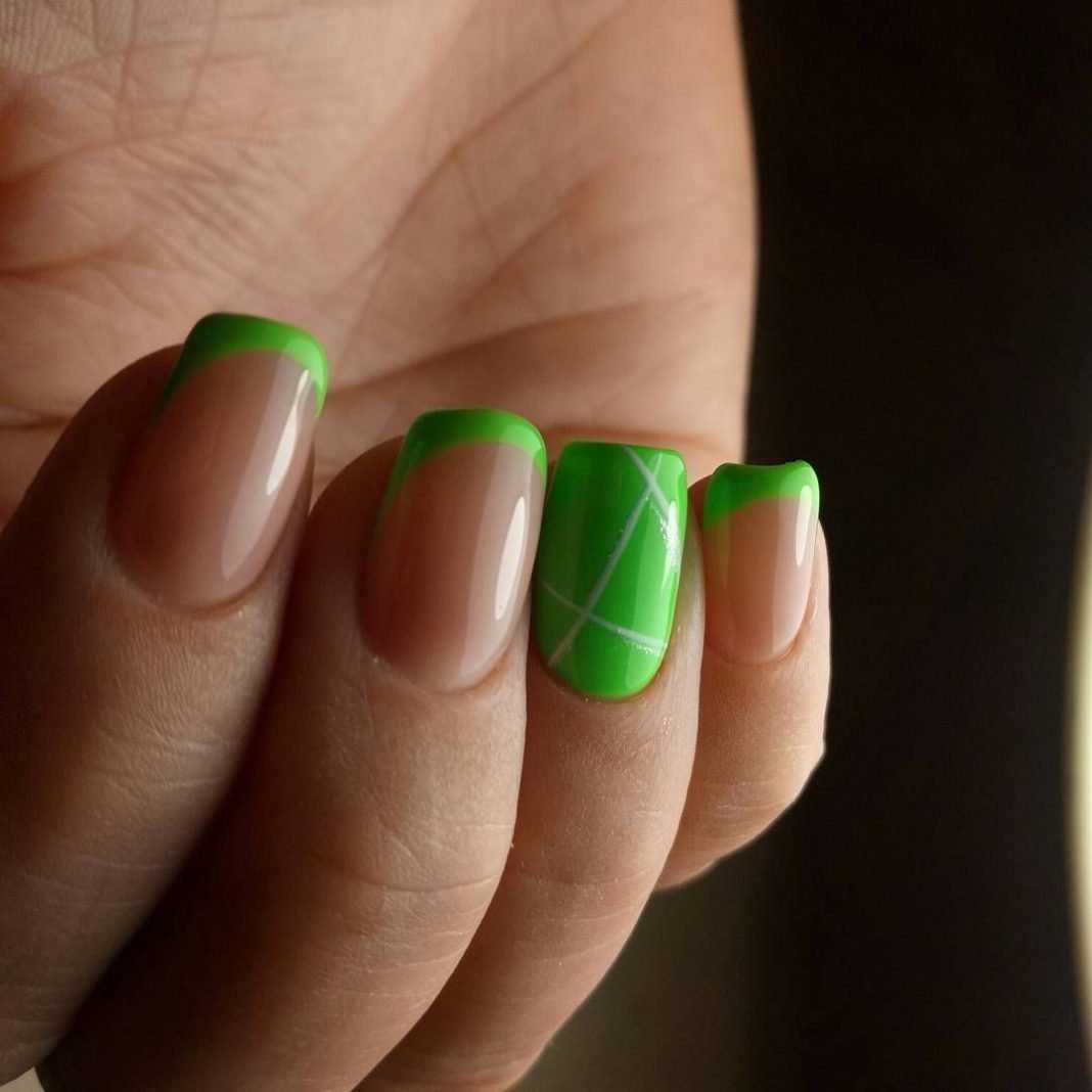 В сезоне 2022 на пике популярности пребывает разноцветный френч, и зеленый цвет как раз входит в топ актуальных палитр. Помимо классических вариантов французского маникюра, мастера дополняют его: