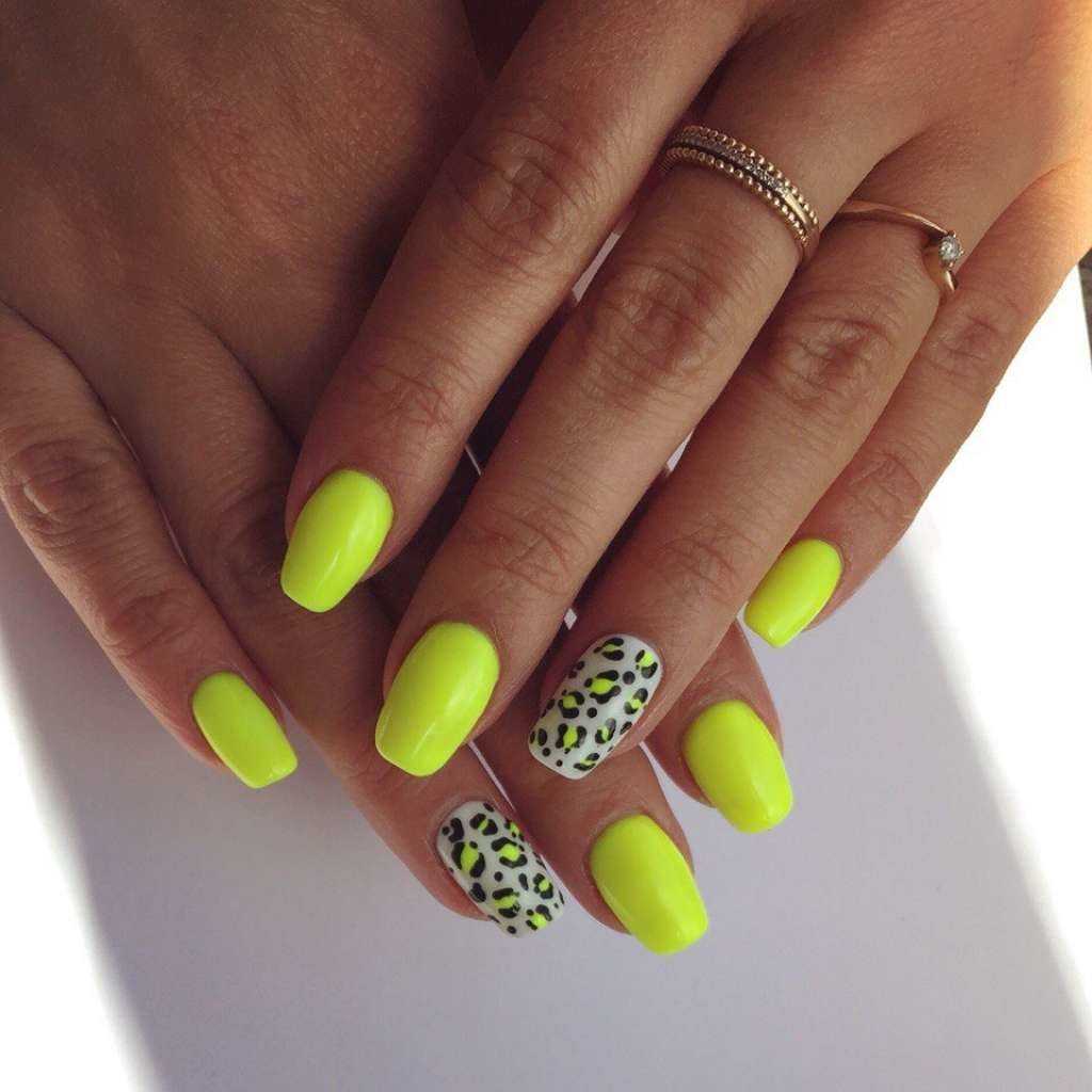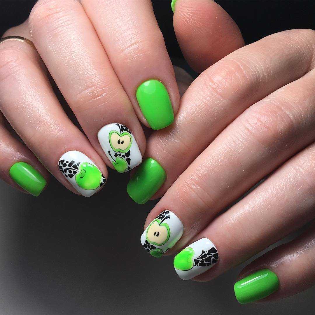 Модно делать красивый градиент от салатового к неоновому желтому цвету. Хорошо смотрится сочетание светло-зеленых оттенков с ярко-желтым цветом, к примеру, яркий акцент на нескольких ногтях. Стильно выглядит фруктовый элемент — просто оформите ноготь в стиле киви.