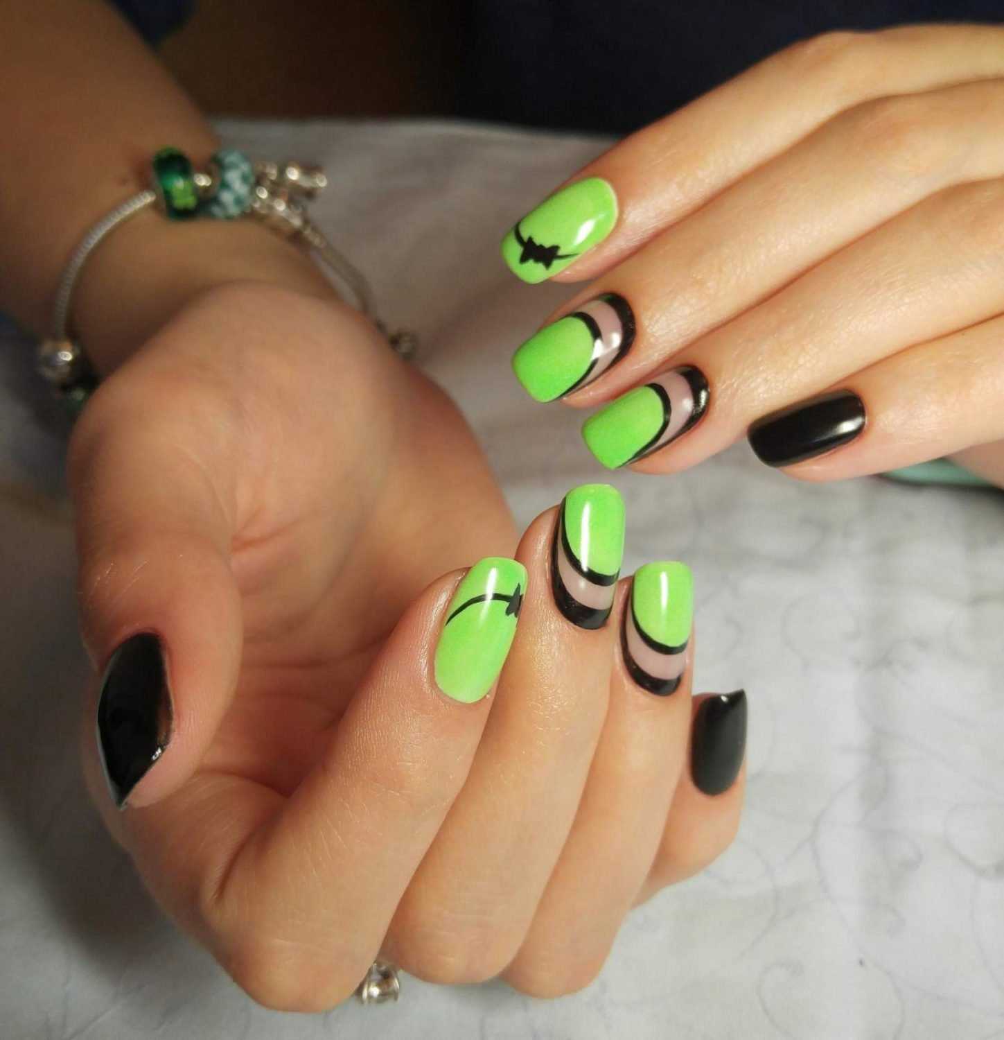 Стильно смотрится переход от черного цвета к зеленому оттенку. С использованием этих стильных цветов применяют техники стемпинг и слайдер. Красиво сочетаются два цвета в технике геометрия: зеленый на черном фоне выглядит загадочно и таинственно.