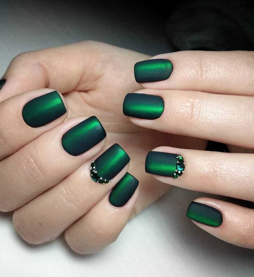 Зеленый матовый маникюр, с дизайном или без, ляжет на короткие ногти как нельзя лучше. Даже однотонное матовое покрытие в темно-зеленой гамме добавит элегантности.