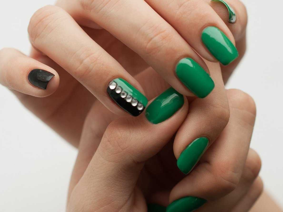 Выгодная комбинация – изумрудный и черный. С помощью данных оттенков можно создать модный и изящный маникюр. Помимо основных цветов, возможно украшение гламурными стразами, блестками золотистого оттенка.