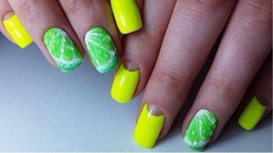 Зеленый придает больше весеннего настроения, но и летнее можно создать, например, нарисовав аппетитный и сочный лайм на парочке ногтей.