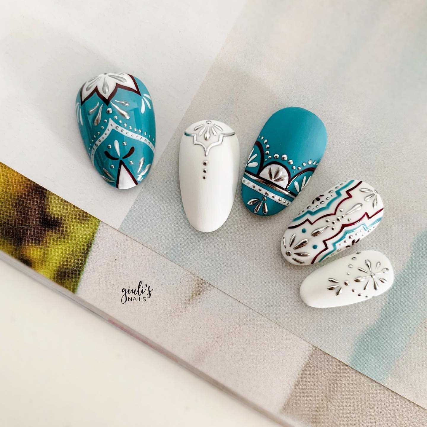 Подобное сочетание будет актуальным, если вы предпочитаете маникюр в этнической тематике или в геометрическом дизайне. Чтобы придать небольшой текстурности, используйте матовое покрытие.