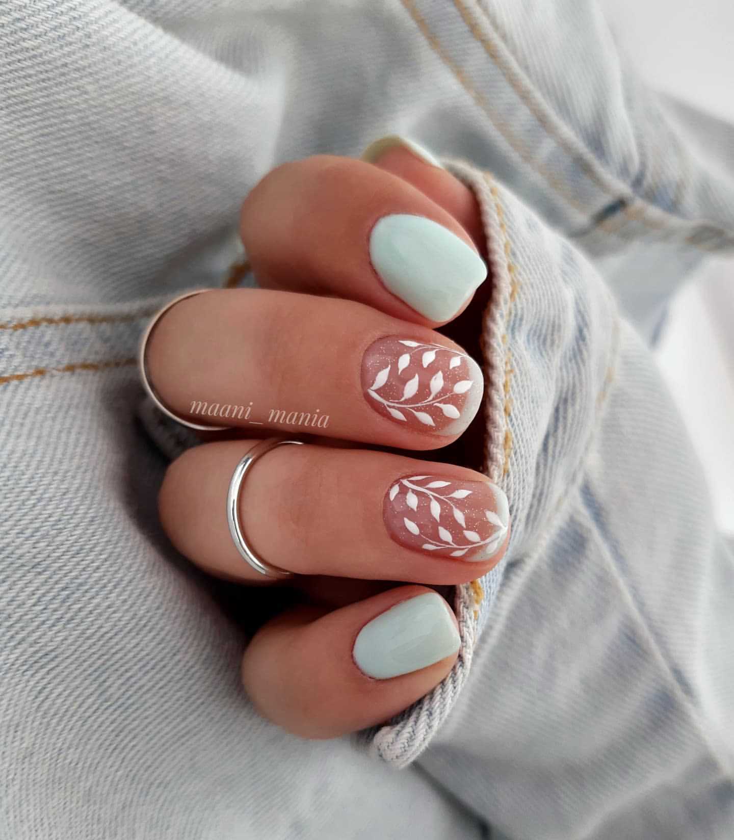 Для выполнения этого маникюра необходим пастельно-мятный и молочно-белый оттенок лака. Указательный и большой палец можно покрасить в молочно-белый цвет, а все остальные пастельно-мятным. Для придания маникюру праздничного послевкусия достаточно воспользоваться цветными наклейками или вручную разрисовать несколько ногтей нежными цветами. Добавьте дизайну сияния с помощью золотой фольги и закрепите свой результат глянцевым топом.