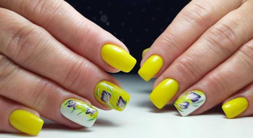 Цветочный принт. На желтом фоне хорошо смотрятся цветочные мотивы. Маникюр актуален для весны либо лета.