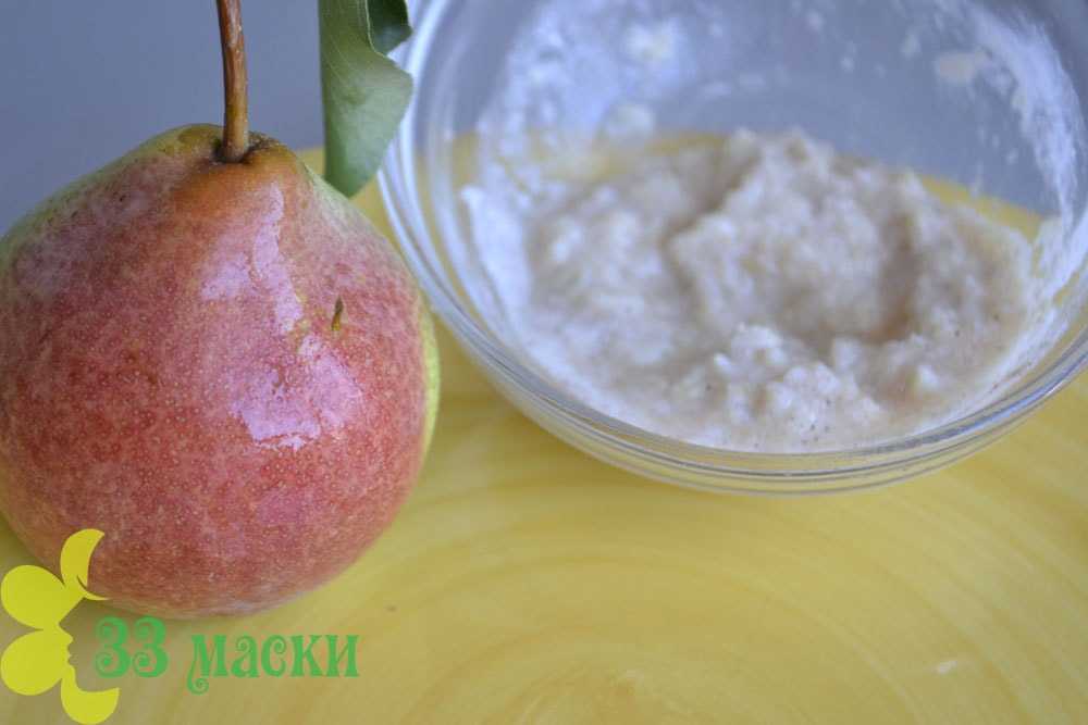 Взять 1 грушу и натереть на мелкой тёрке. Отварить 100 г риса в несолёной воде, чтобы он полностью разварился. Смешать 1 столовую ложку натёртой груши и 1 столовую ложку отваренного риса. Нанести полученную смесь на кожу лица, на 20 минут. Смывать маску водой комнатной температуры.