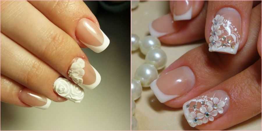 Лепка – это объемные рисунки на ногтях. Дизайн появился относительно недавно, но уже завоевал свою популярность среди женского пола. На свадебное торжество актуально делать цветочки, вензеля или бантики с 3D эффектом.
