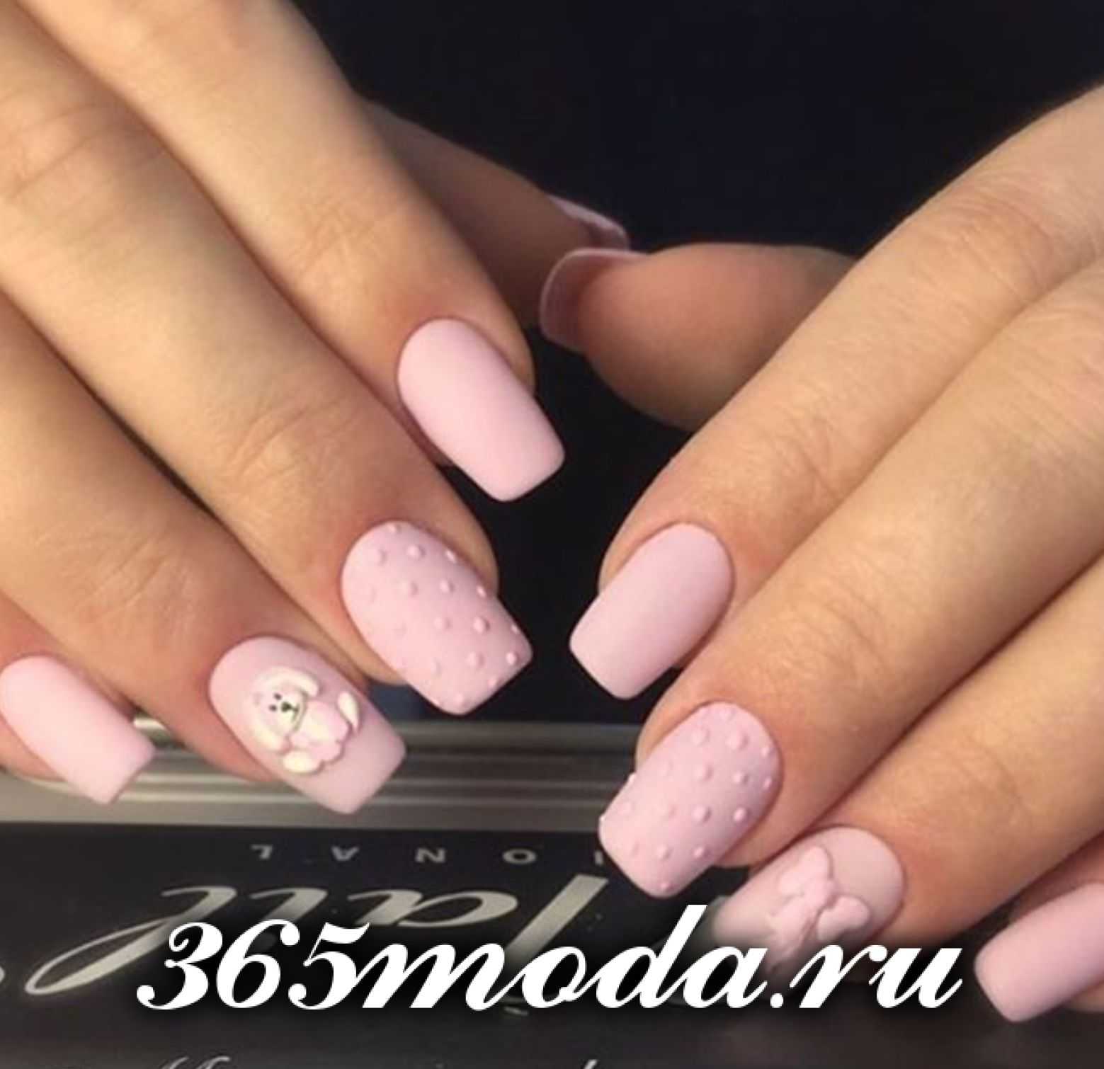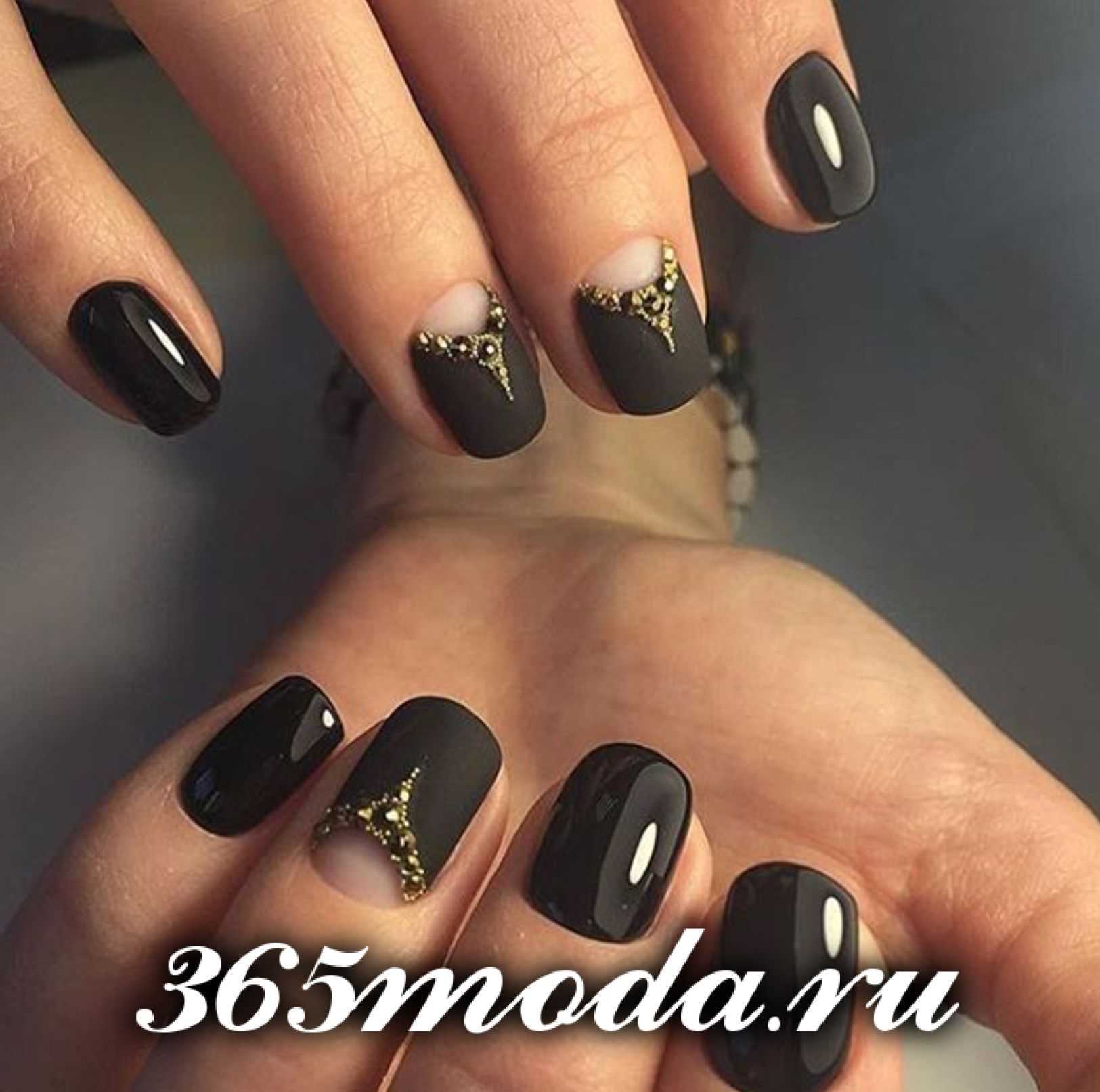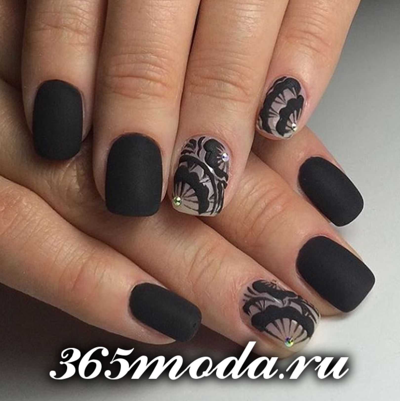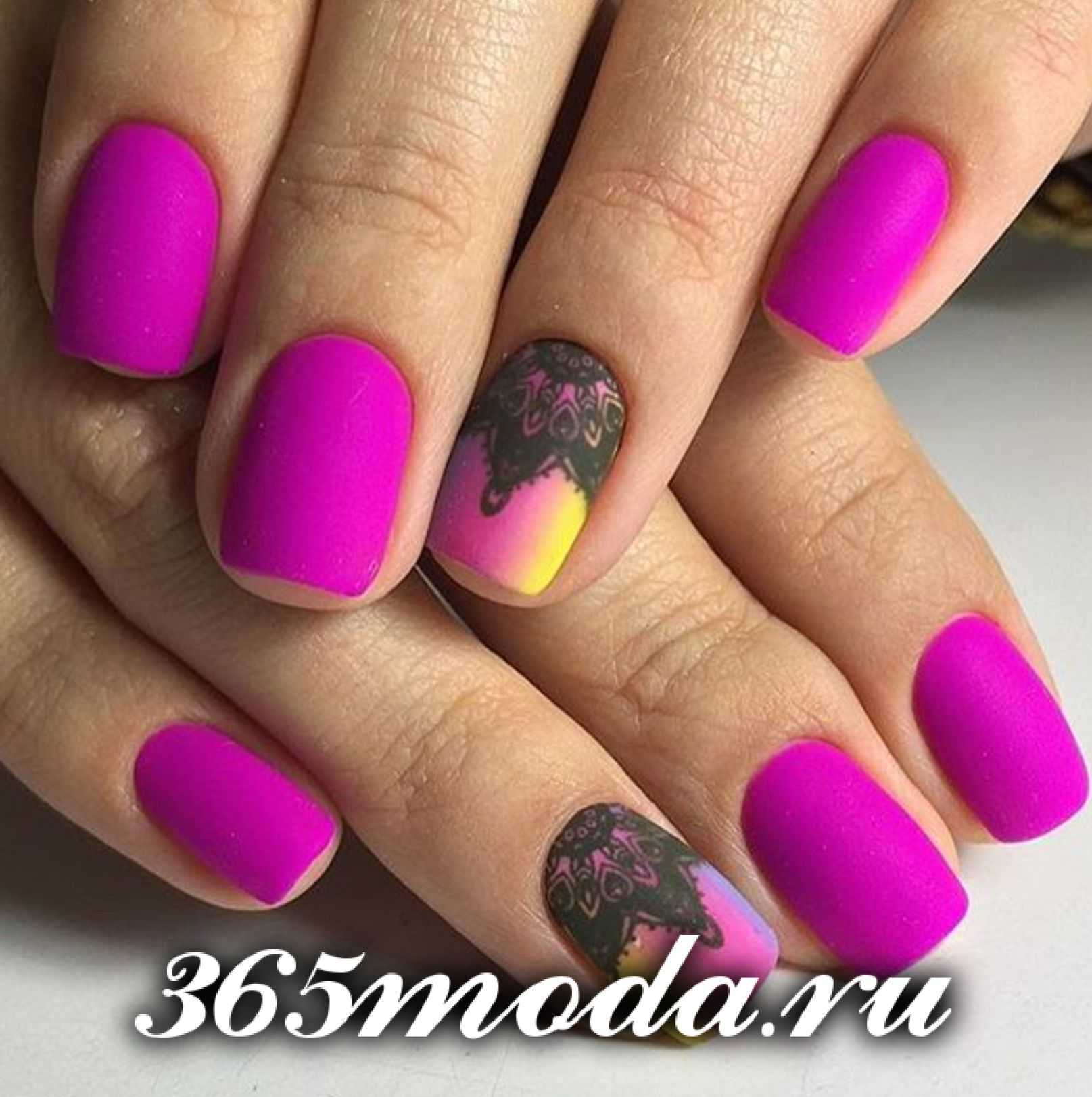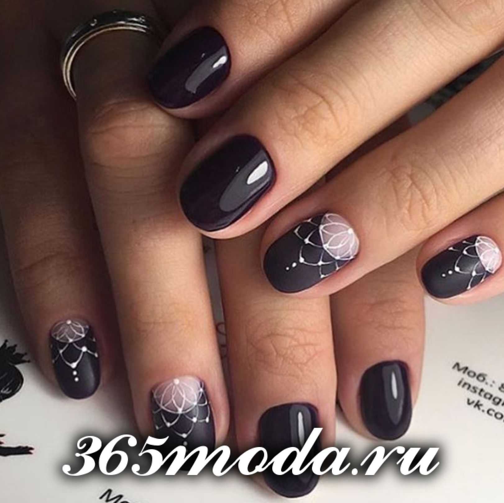 Матовый дизайн самый универсальный из всех. С таким можно показаться в офисе и на празднике. Ничего лишнего, только стиль. Но есть у такого варианта и свой недостаток – матовое покрытие хорошо подчеркивает все недостатки поверхности. Чтобы избежать этого, перед покрытием, ногтевую пластину нужно хорошо выровнять.