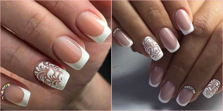 О нем мы уже рассказали выше: он имеет белую полоску, а остальное закрашивается нейтральным гель-лаком. Такой вариант прекрасно подойдет для стандартной свадьбы в светлых оттенках.