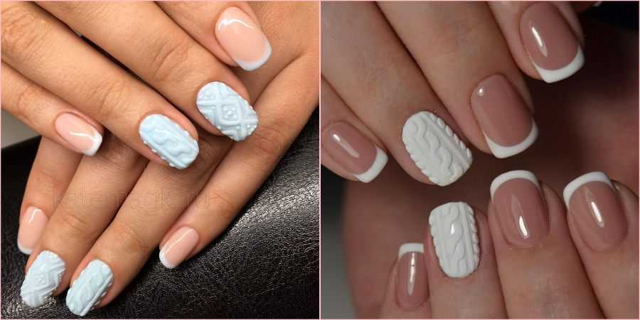 «Свитерок» – еще так называют рассматриваемый дизайн ногтей. Выглядит он необычно и прекрасно сочетается с френчем. Замечательная идея сделать вязаные мотивы на зимнее торжество, ведь они превосходно дополнят образ новобрачной в шубке, свитере или кардигане.