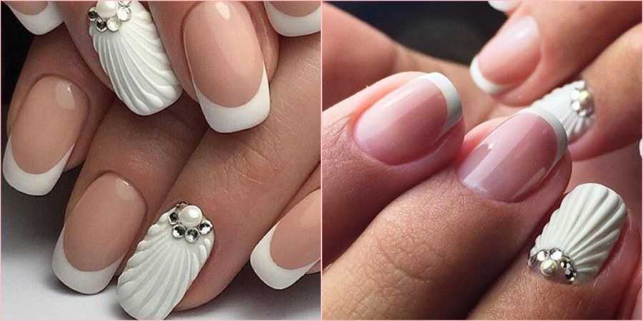 Сочетание имитации ракушки и френча выглядит очень стильно и модно. Обычно узор рисуют на безымянном пальчике, а остальные делают в стиле французского маникюра.