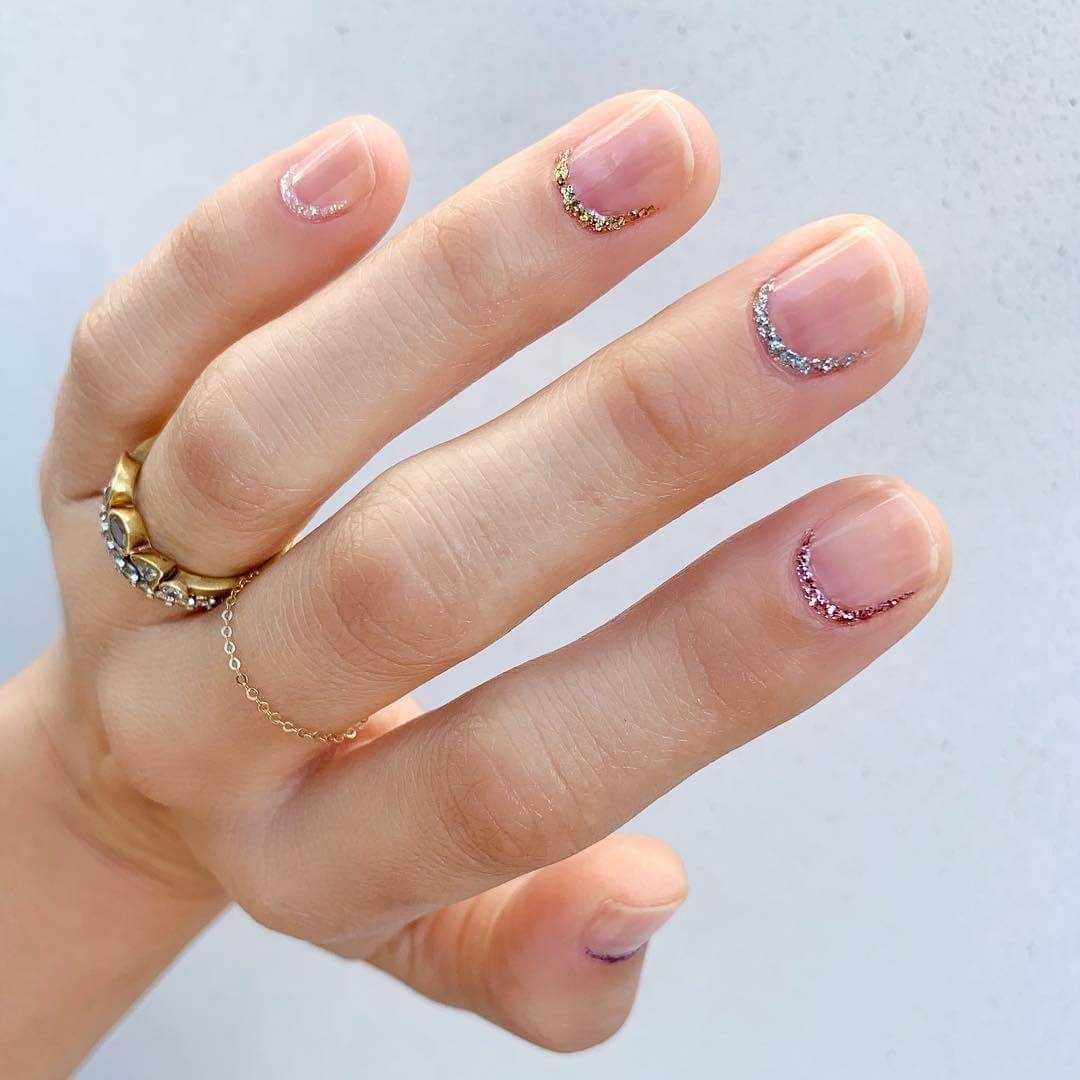 Это весной и летом будет в тренде нюдовый или прозрачный маникюр, дополненный минималистичной аркой или лункой из блесток.