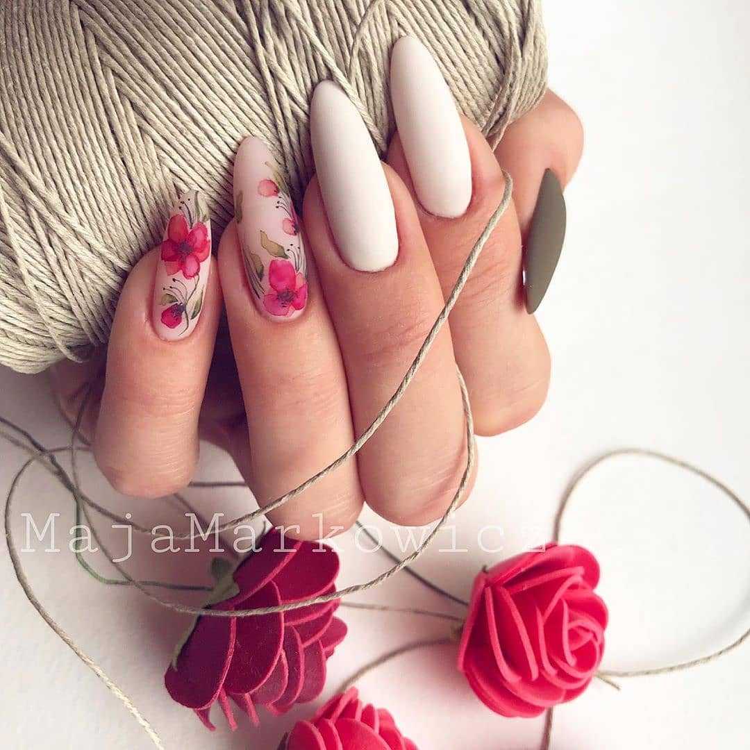 Также остается на пике популярности. Розы и некоторые другие цветы будут смотреться на ногтях не только актуально, но и очень красиво. При этом цветы могут быть как нарисованы, так и наклеены на ноготь.