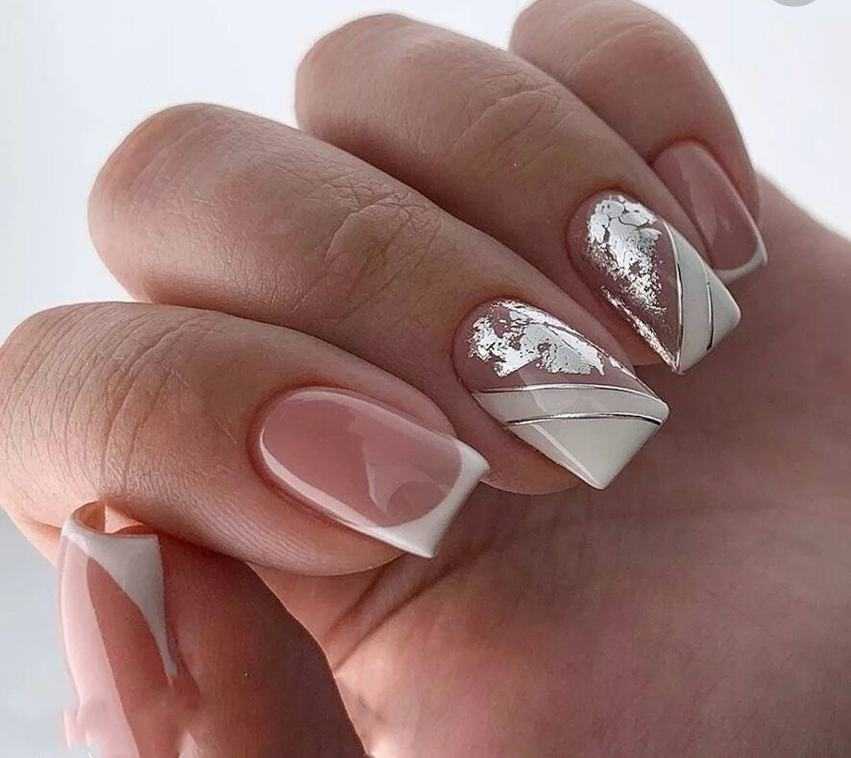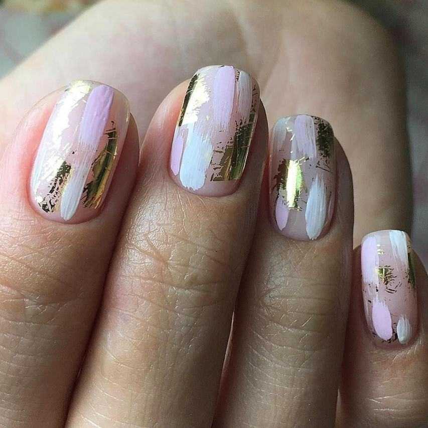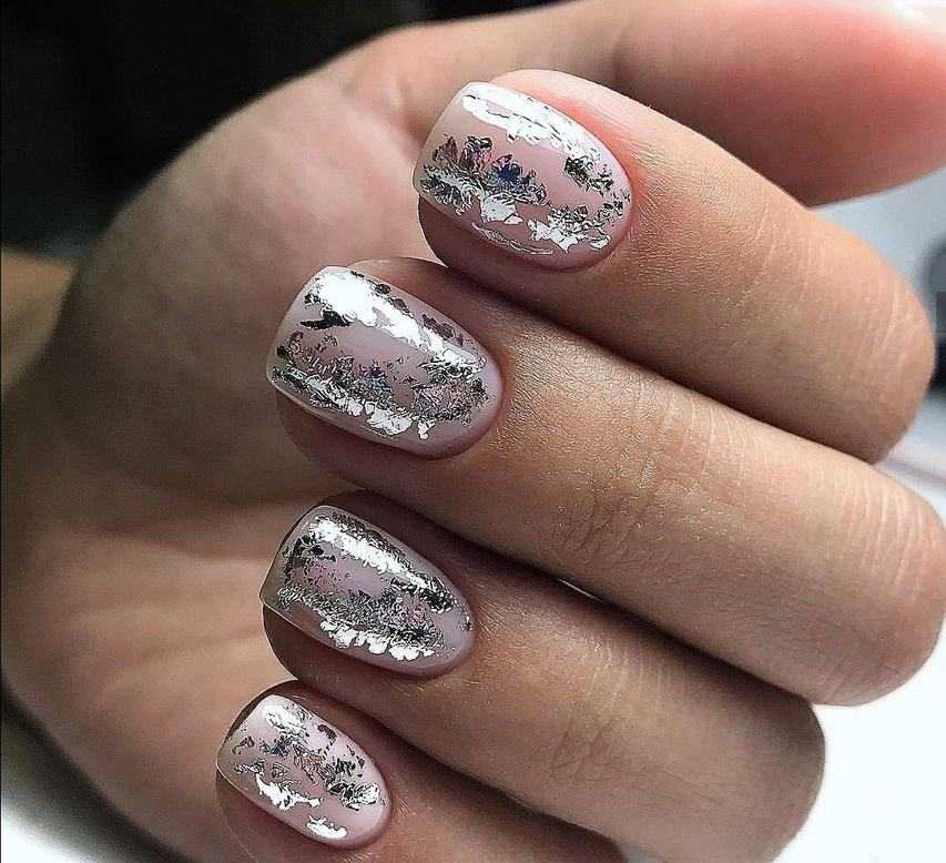 Хотя в этом маникюре присутствуют блестящие элементы в виде фольги, но они приглушены матовым топом. В качестве основы идеальный молочный гель-лак.