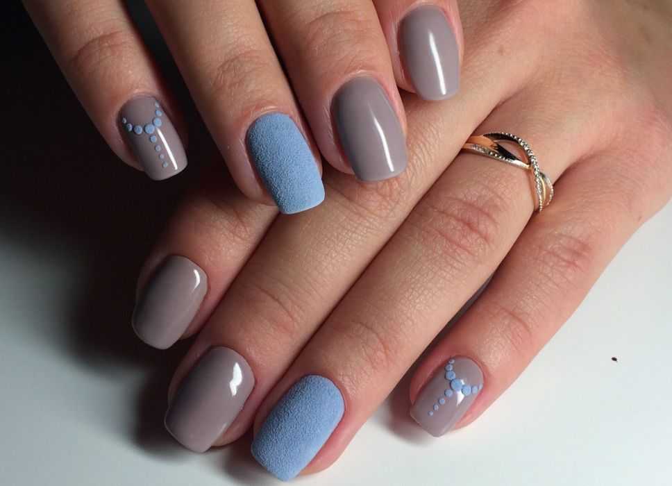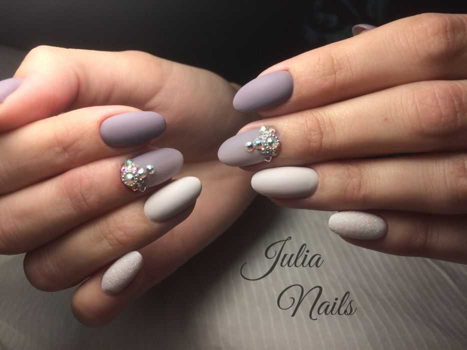 Матовый серый маникюр выглядит очень стильно и оригинально даже в чистом виде, если подобрать красивый оттенок. Часто матовый дизайн смешивают с глянцем, создавая тем самым комбинированный маникюр. А чтобы облагородить и разнообразить дизайн на серые матовые ногти наносят объемный рисунок, присыпают мерцающей пудрой или украшают бисером, блестками и стразами.