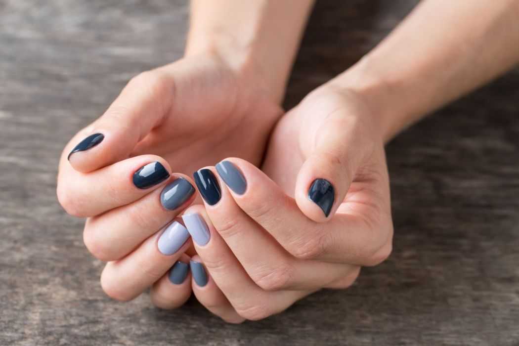 Сейчас особенно популярен серый маникюр 2020 с сочетанием серых оттенков от светлого до темного. Если у вас нет такого количества серых гель-лаков, то можно поступить следующим образом: на первый ноготок нанести гель-лак оригинального цвета, а для каждого последующего ногтя разбавлять оригинальный цвет на палитре либо базой, либо белым шеллаком.