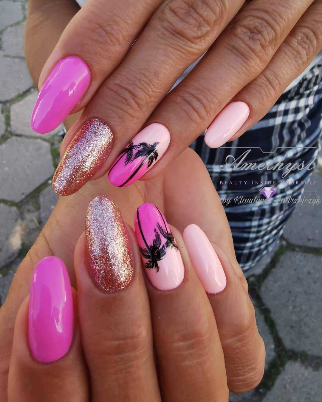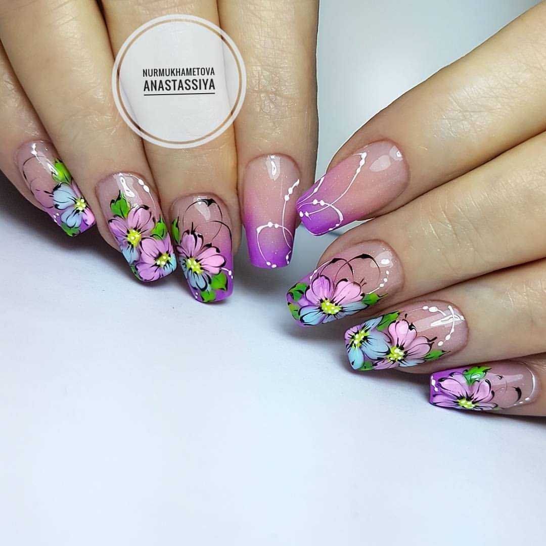 Цветочные мотивы на ногтях делают образ женственным. Для длинных ногтей можно выбрать раскидистые пальмы, маленькие и изящные веточки, забавные кактусы или множество мелких цветов.