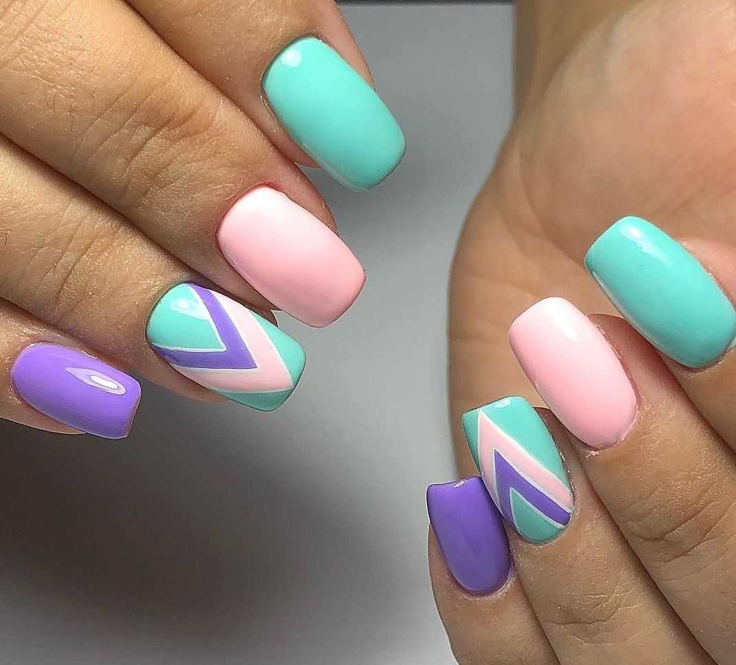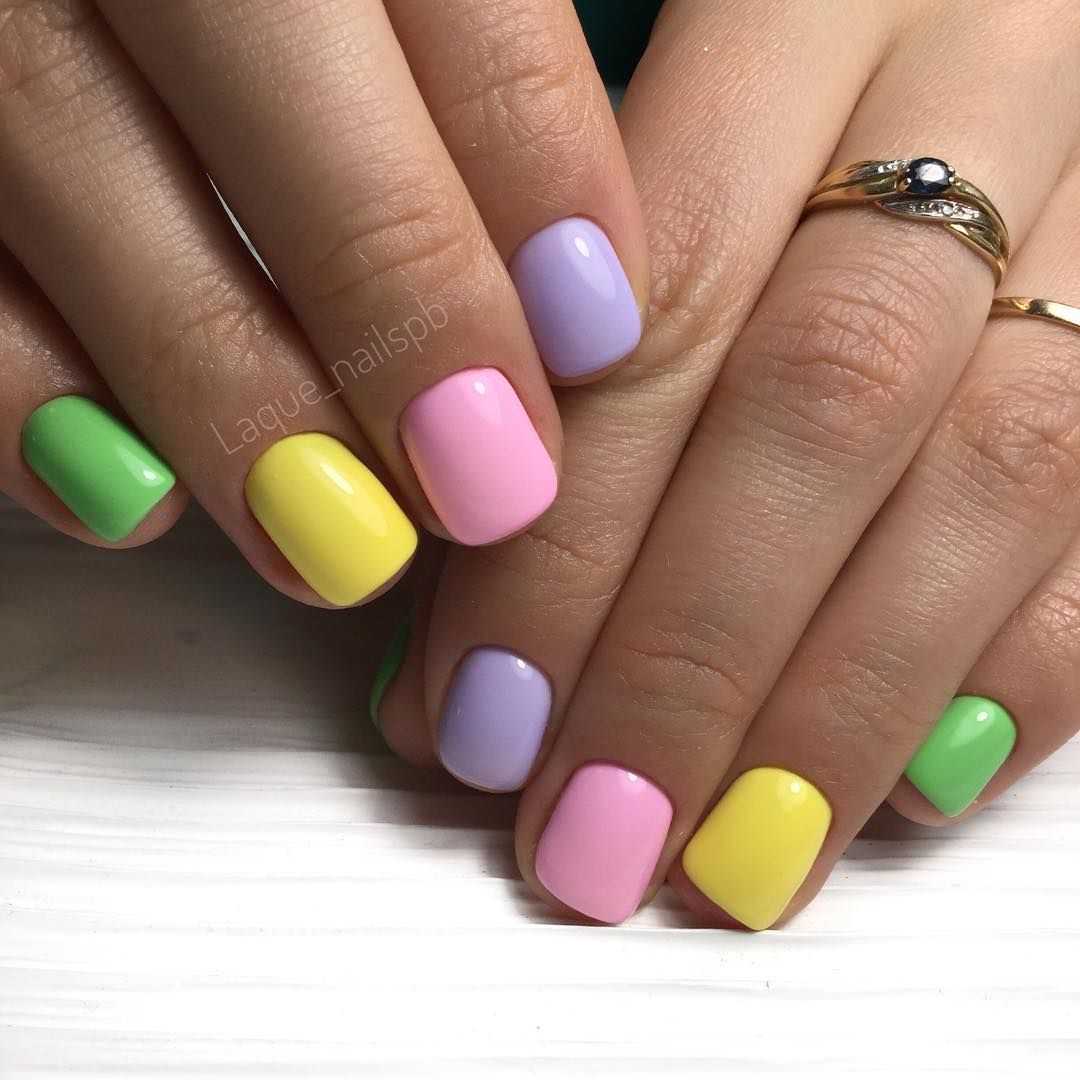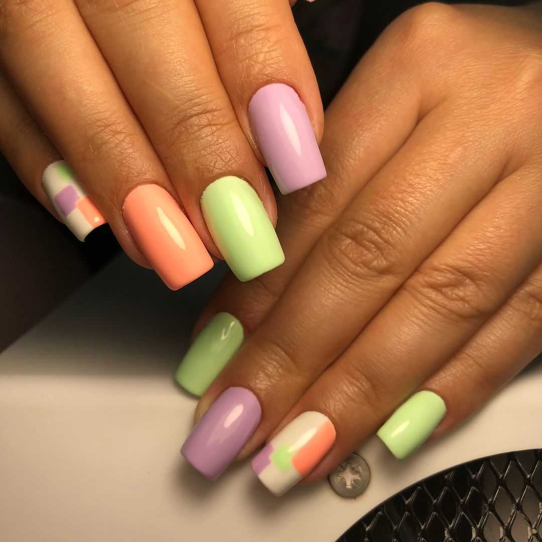 Многоцветный маникюр стал очень популярным благодаря своей универсальности. Любая модница может легко подобрать аксессуары и одежду к таким ногтям. Правильно выполненный такой маникюр легко впишется в самый строгий дресс-код или смело подчеркнет ваше веселое настроение в любую погоду. Выберите свои оттенки прямо сейчас!
