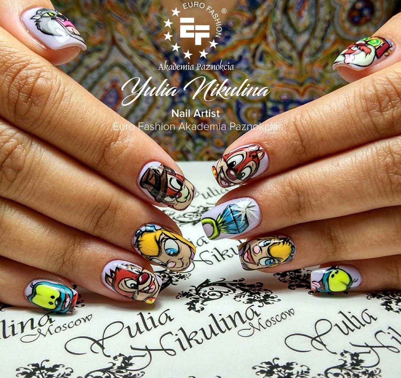 Модно добавлять на ногти изображения героев анимационных сериалов. Интересно смотрится маникюр, когда герой на разных ногтях размещен в разных позах. Актуален дизайн с рисунком, который собирается из нескольких частей.