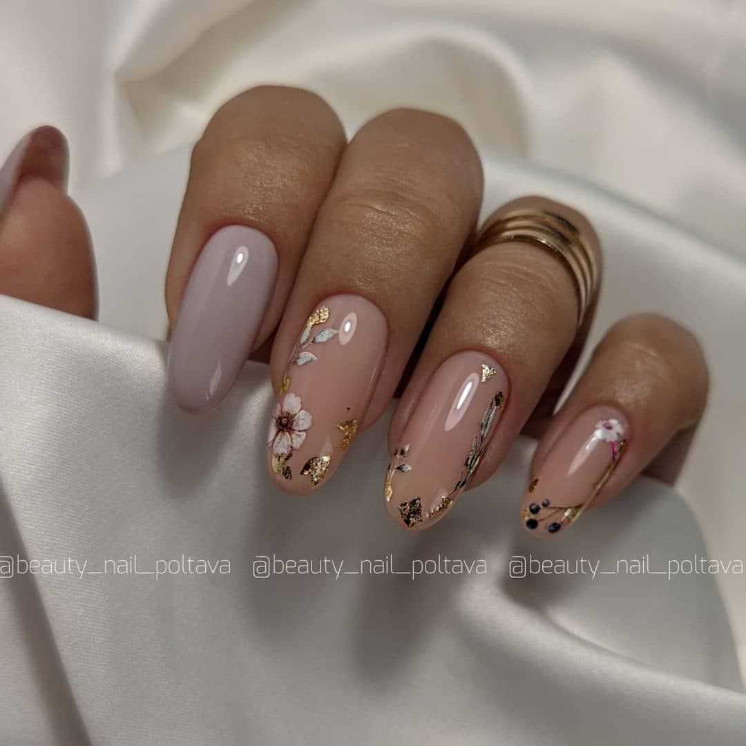 Цветы на ногтях смотрятся очень нежно и романтично, они говорят о мечтательном настроении и мягком характере обладательницы данного маникюра. Для фона можно использовать лиловый, сиреневый, нежно-розовый и белый шеллак.