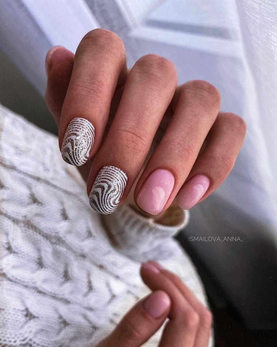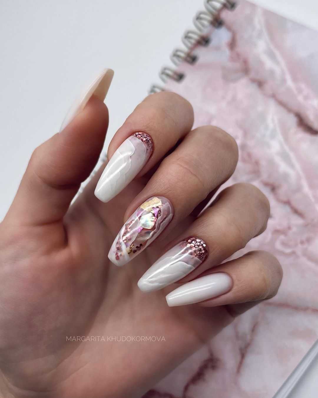 Беспроигрышно смотрится сочетание белого с отражающим декором. В маникюре 2021 этот вариант уже назвали хитом. Экспериментируйте: используйте маникюрную скотч-ленту, фольгу, «битое стекло», лак-металлик или голографическую пудру для ногтей.