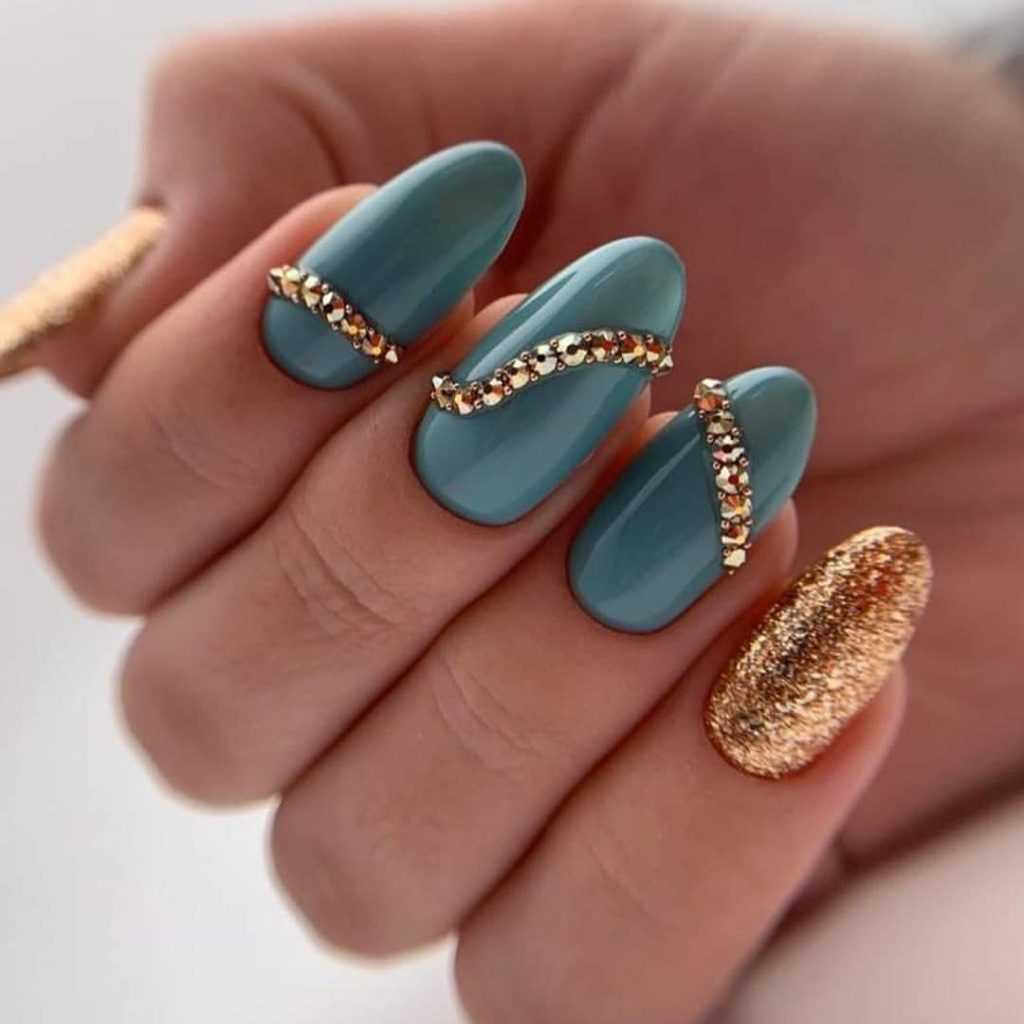 Модный голубой маникюр с дизайном и блестками