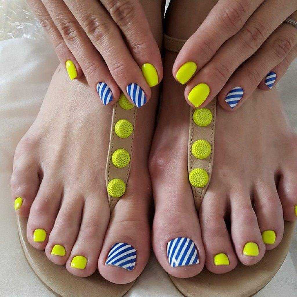 Яркий маникюр и педикюр в одном стиле смотрятся очень эффектно. Вы можете выбирать любые сочетания цветов и украшения. Чаще всего яркие оттенки выбирают в летний сезон. Но в другие времена года такое оформление ноготков будет смотреться не менее круто.