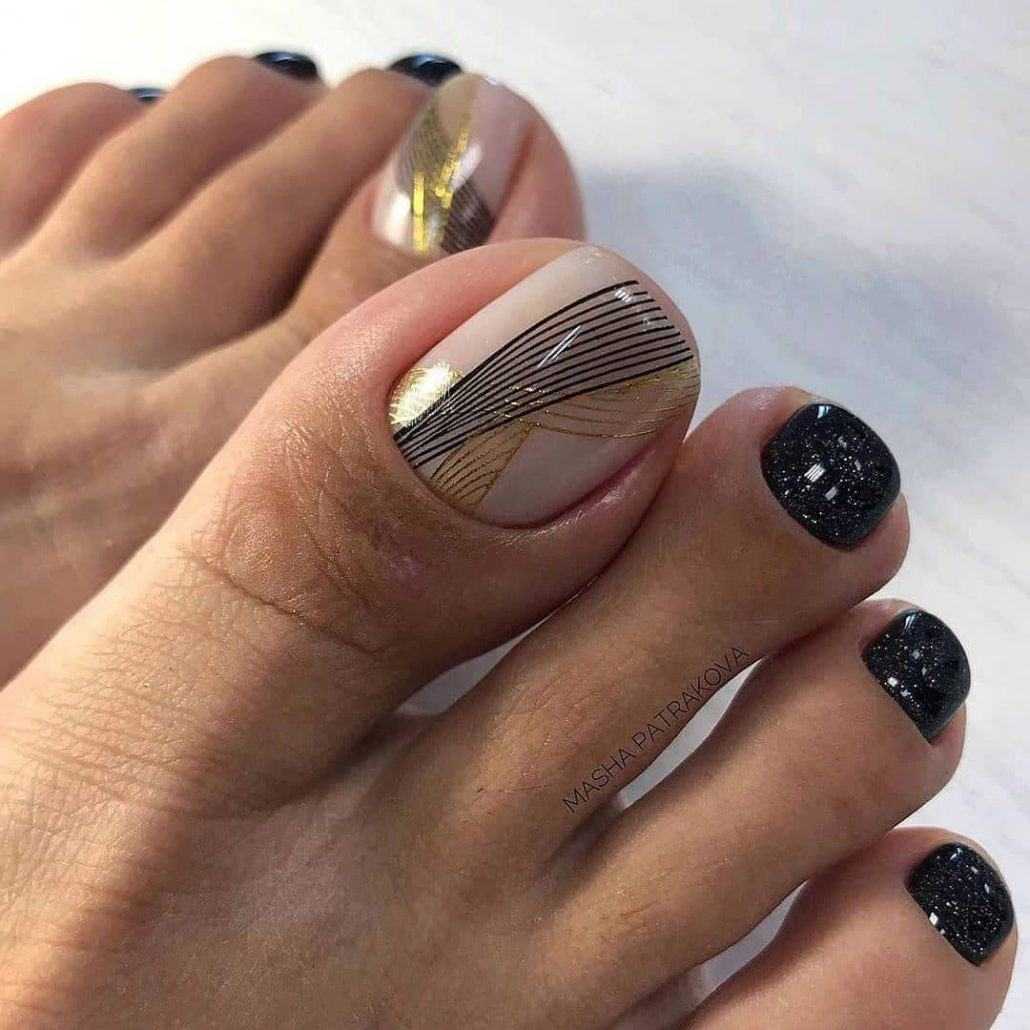 Французский педикюр в неклассическом исполнении. Это комбинация из черно-белых ногтей с «улыбкой» из золота. При этом золото наноситься не ровно, а как бы растекаясь по ногтю