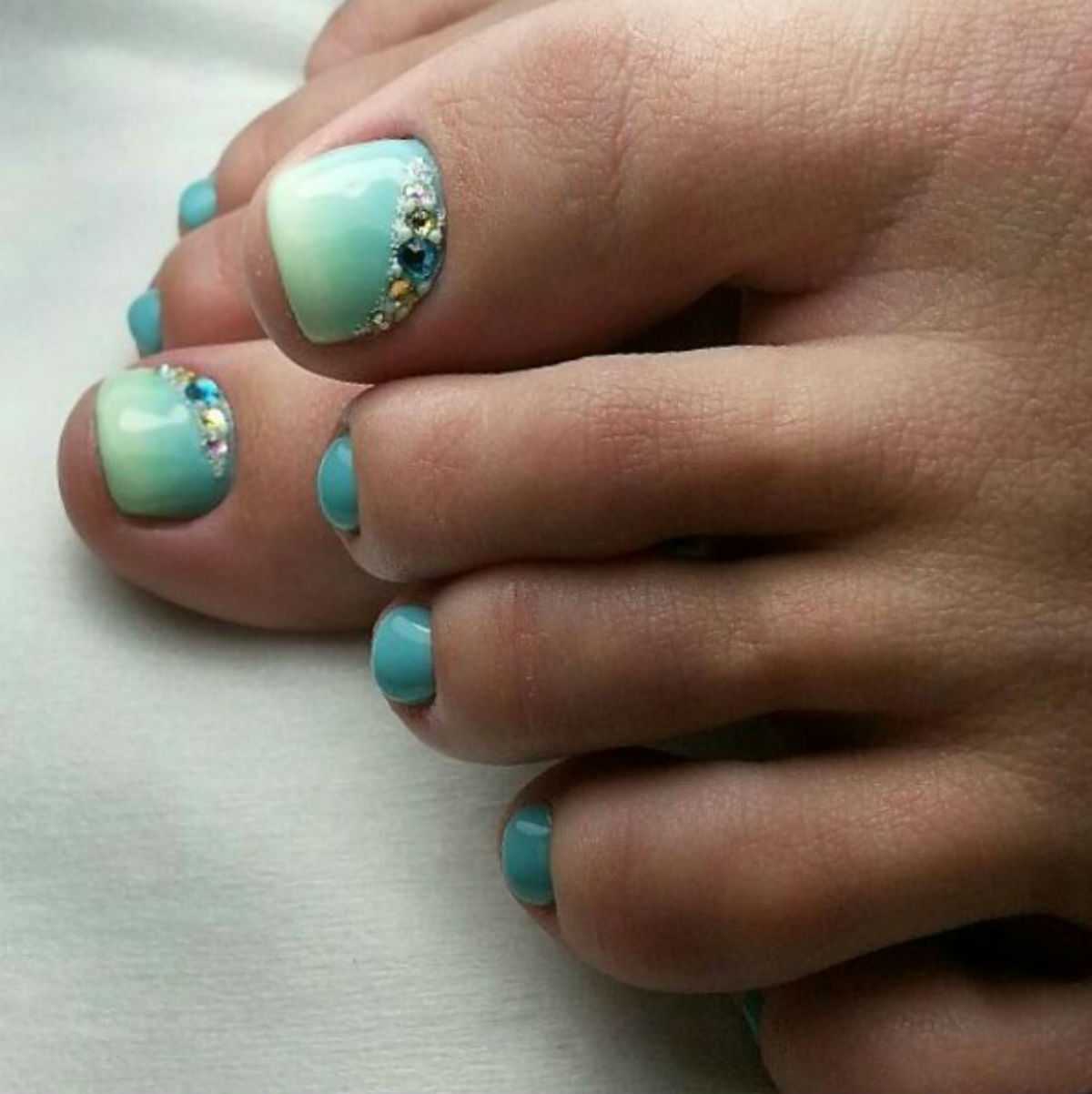 - градиент – аккуратно и нежно выглядит педикюр в светлых оттенках с градиентным переходом, можно менять насыщенность цвета от кончика к кутикуле или оттенок, например, от голубого к розовому или от бежевого к белому;